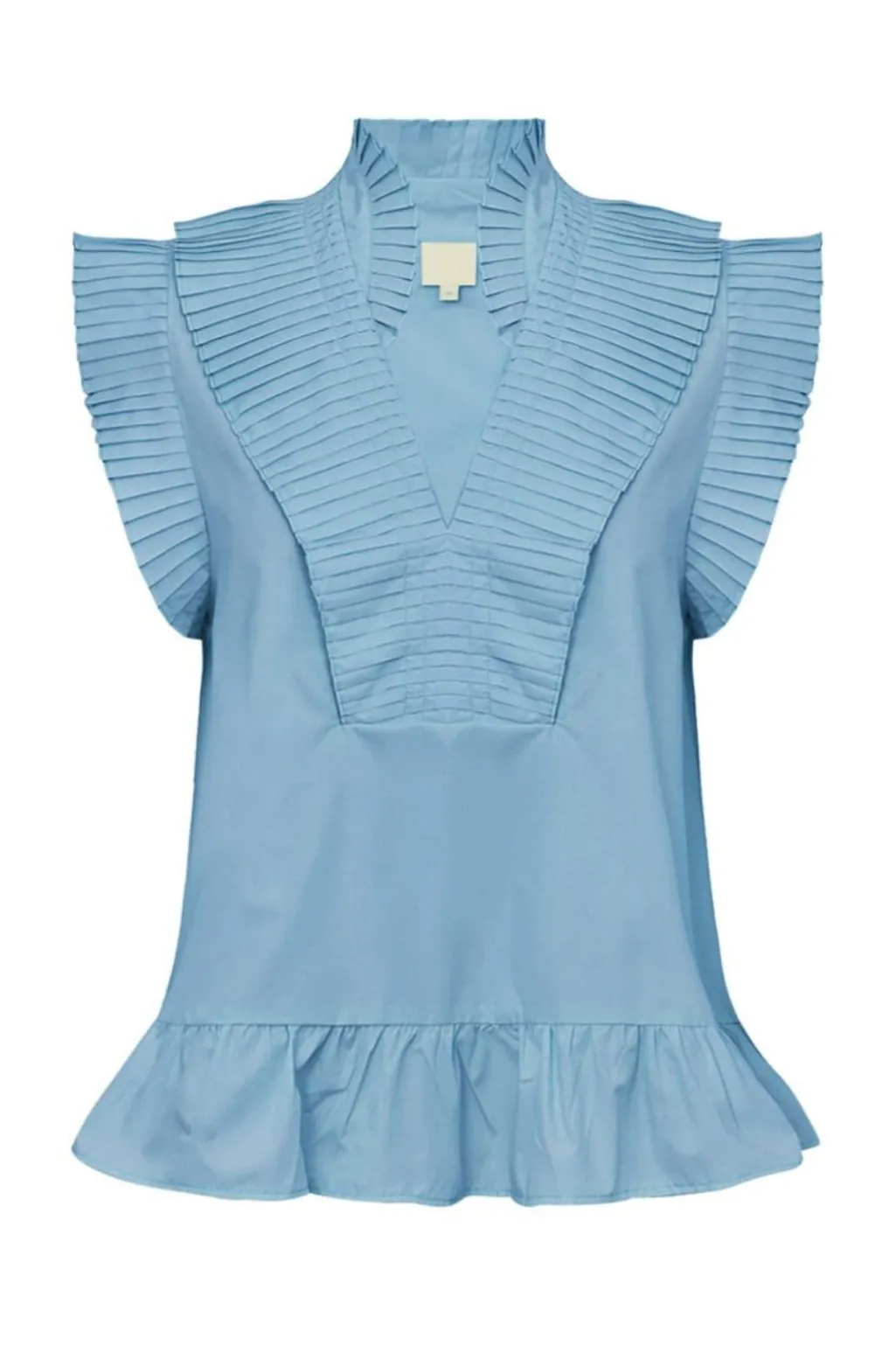 Isblå top fra Gossia med A-facon og dyb V-udskæring. De plisserede flæser ved krave, hals og ærmegab giver toppen et feminint præg.
