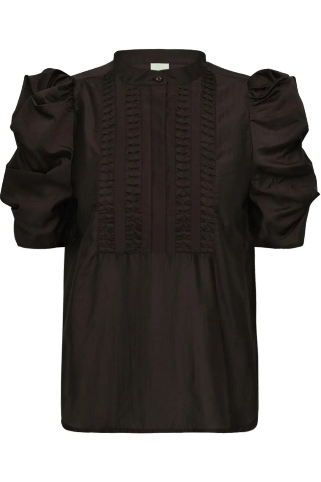 En brun bluse fra Gossia med plisserede detaljer på brystet og pufærmer. Blusen har en skjortekrave og kan bruges til både formelle og afslappede lejligheder.