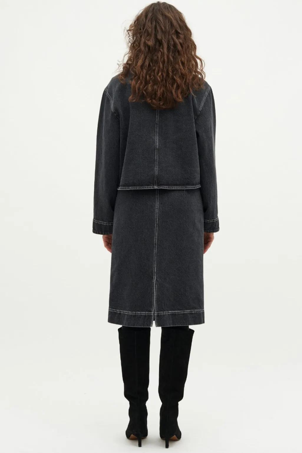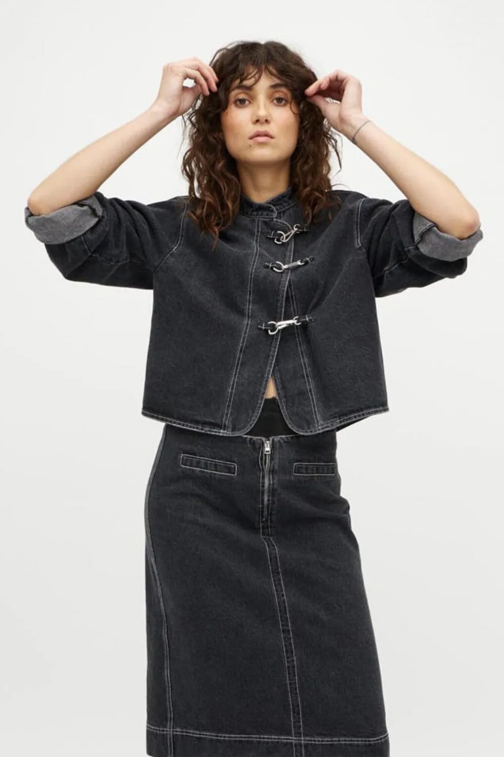 Grå jakke fra Global Funk lavet af bomuld. Jakken har tre metalspænder foran og en høj krave.