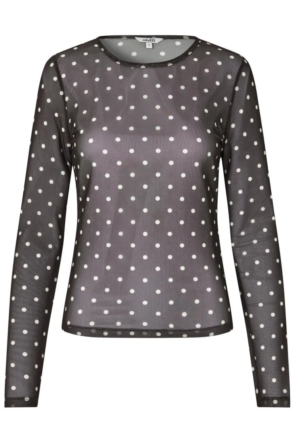 Langærmet bluse fra MbyM med hvide prikker på sort, semi-transparent stof. Blusen har rund halsudskæring og pulloverdesign.