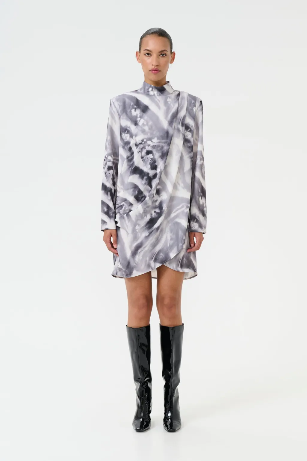 Kort kjole fra Gestuz med høj krave og lange ærmer. Kjolen har et sort og hvidt dyreprint med draperinger på den ene side og flæsedetaljer.