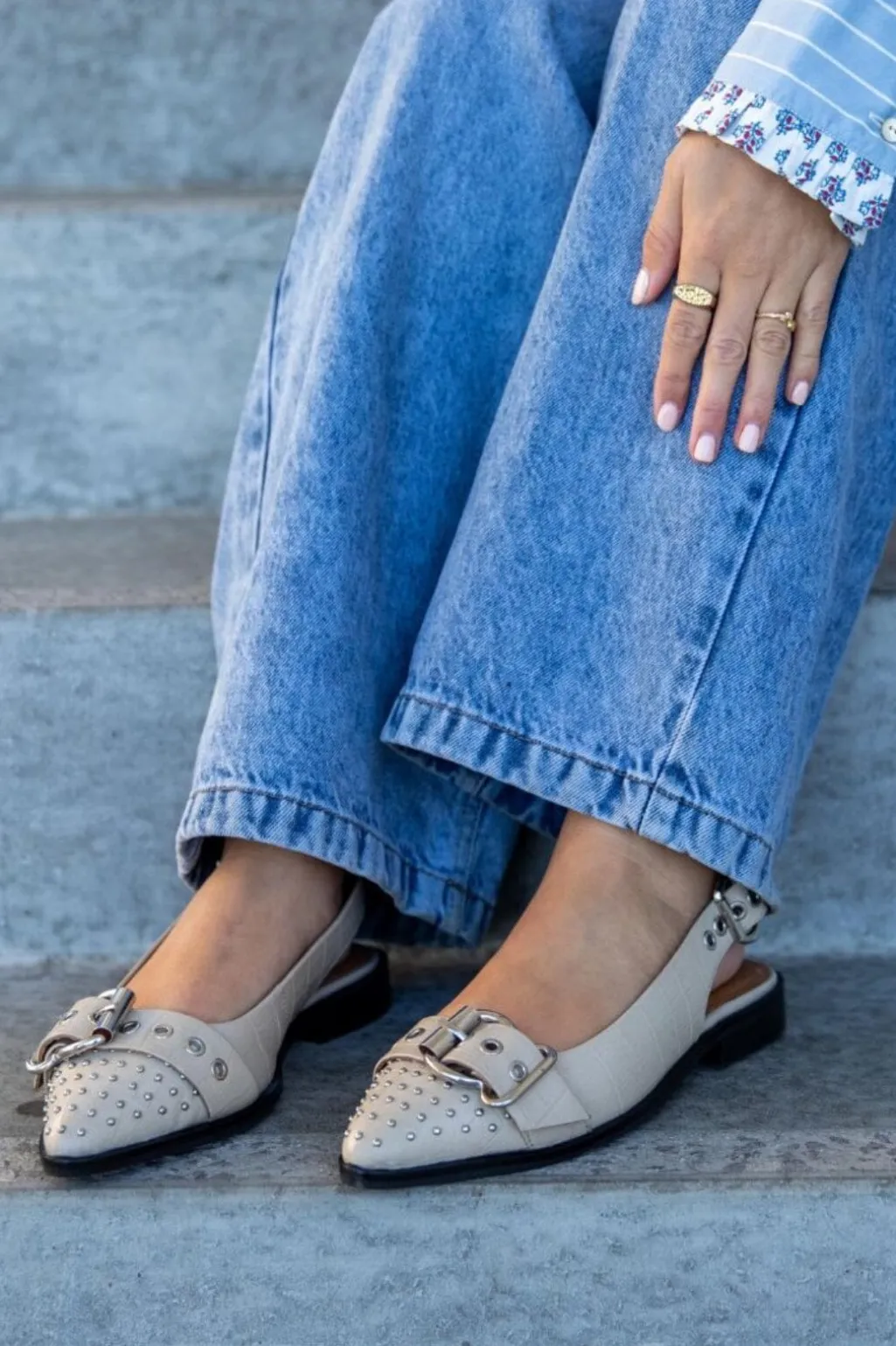 Beige sko i læder med spids tå og nitter fra Copenhagen Shoes. Skoene har en sølvfarvet spænde-lukning og en lav hæl, der gør dem praktiske til hverdagsbrug.