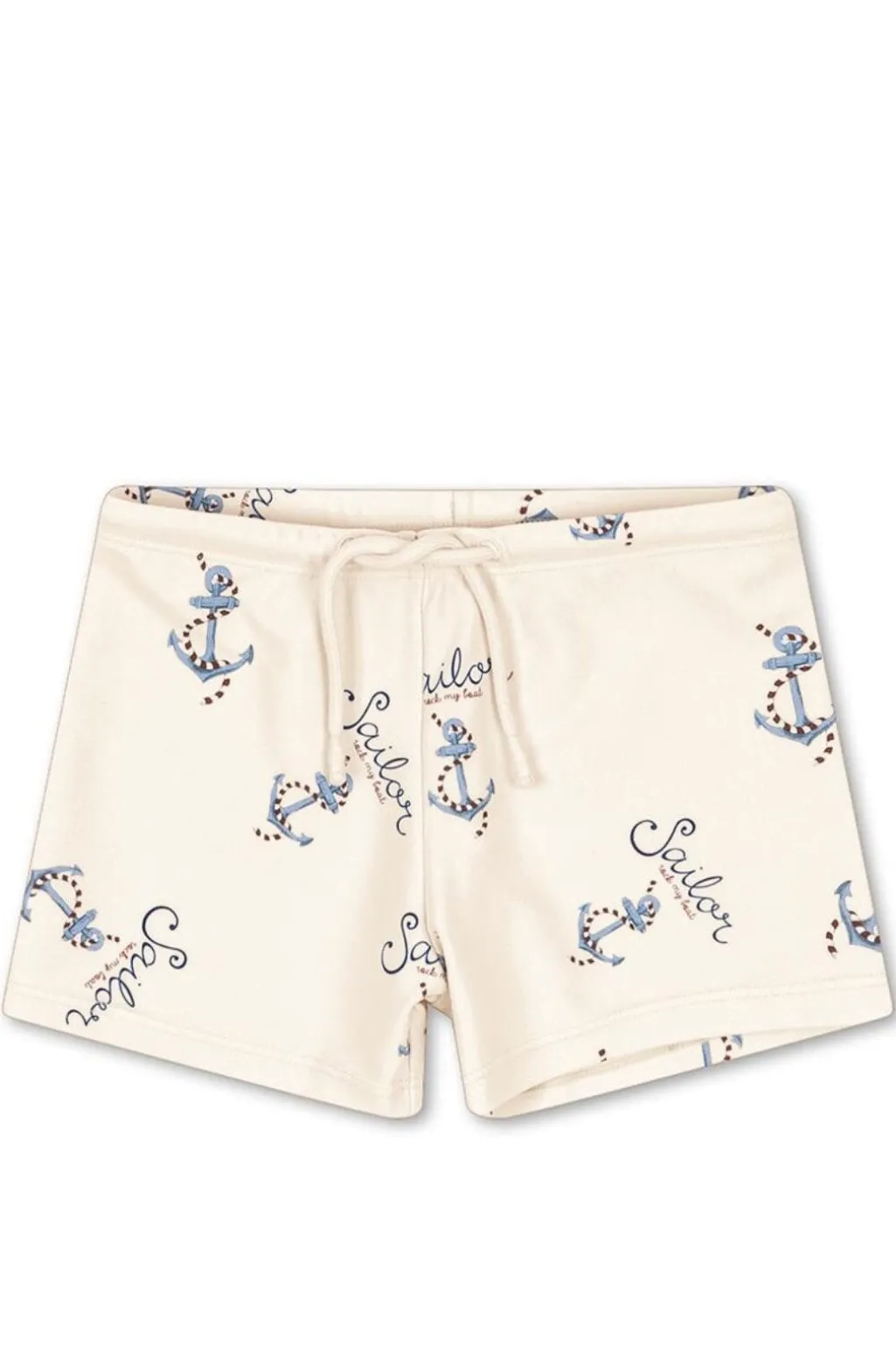 Lårkorte badebukser fra Konges Sløjd i cremefarvet stof med blå ankre og Sailor-tekst. Bukserne har en justerbar snøre i taljen og er designet til vandaktiviteter.