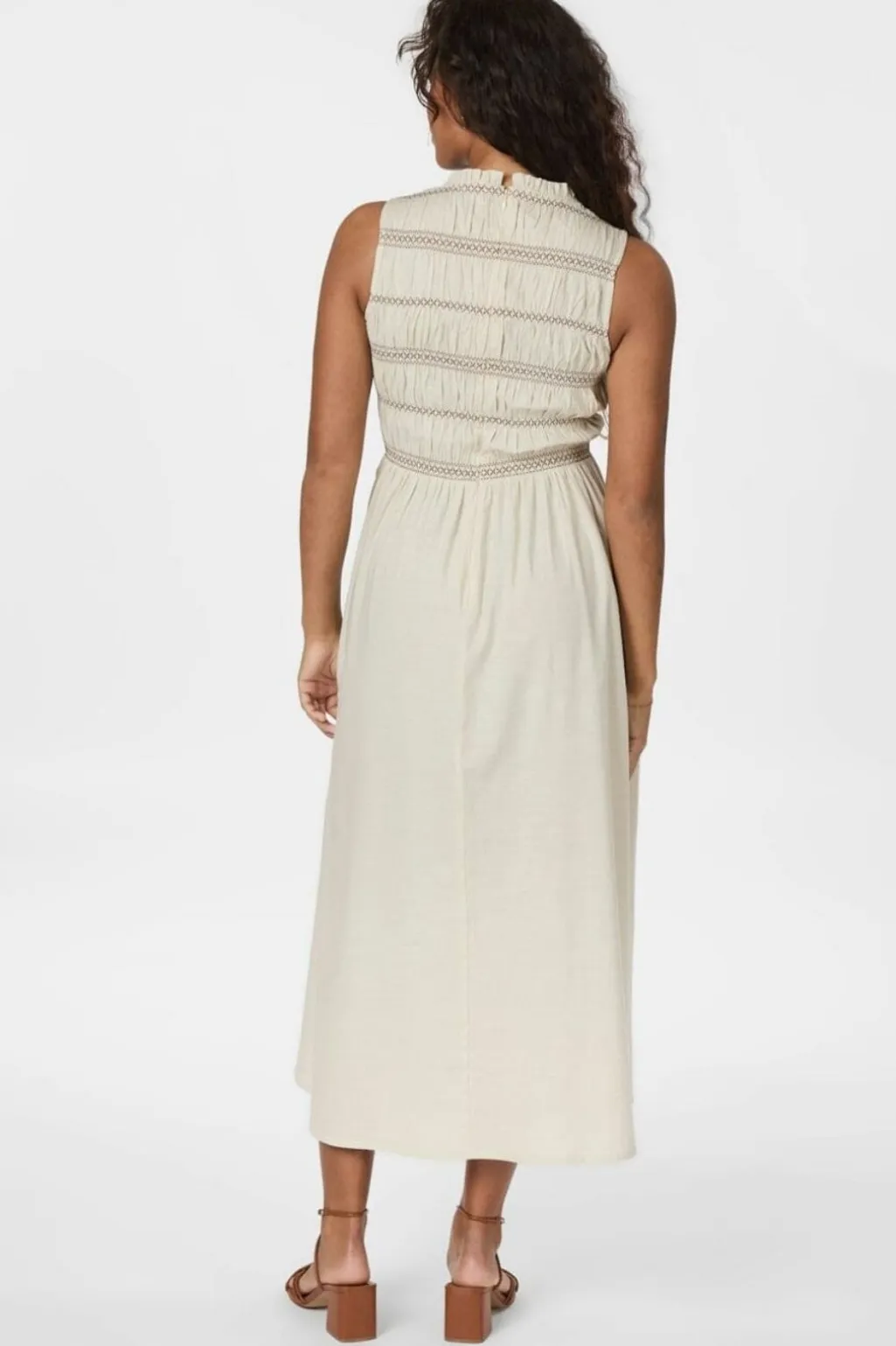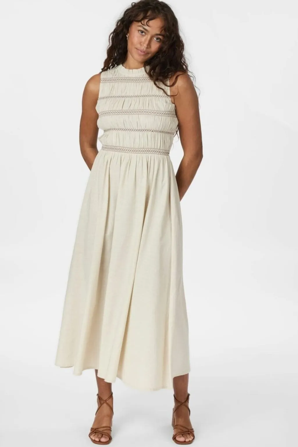 Ærmeløs kjole fra Neo Noir i cremehvid bomuld. Kjolen har smock-detaljer på overdelen og en høj halsudskæring. Nederdelen falder løst til midt på læggen.