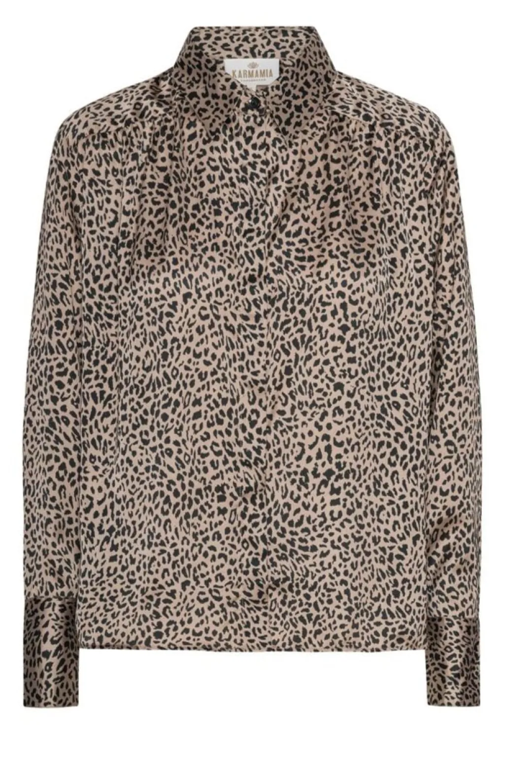 Skjorte fra Karmamia med beige leopardmønster. Skjorten har en klassisk krave og knapper hele vejen ned. Stoffet kombinerer bæredygtighed med holdbarhed.