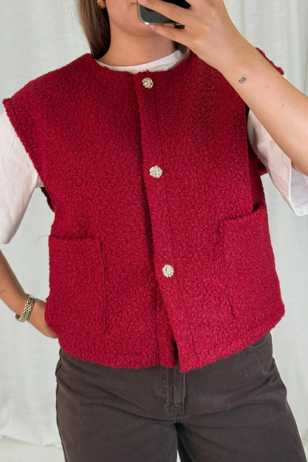 Bordeauxvest fra A-bee, lavet af en blanding af bomuld og polyester. Vesten har perledetaljer og knaplukning.