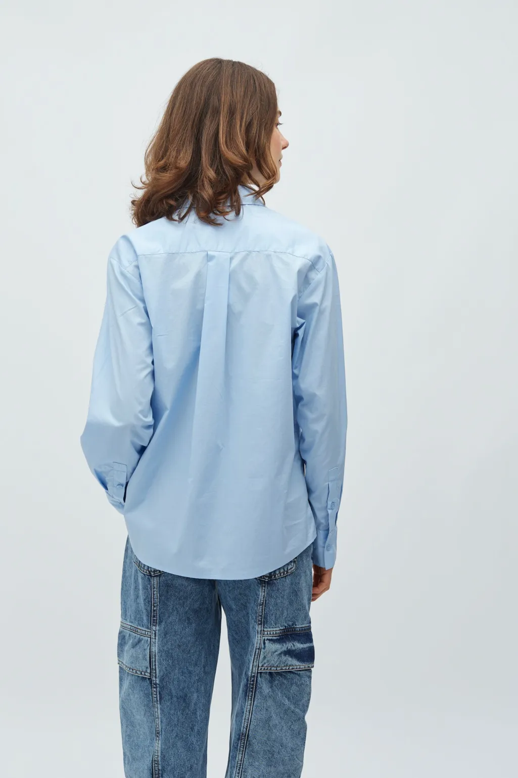 Lyseblå skjorte fra MbyM, lavet af 100 % bomuld. Skjorten har en løs pasform, lange ærmer og en knaplukning foran.