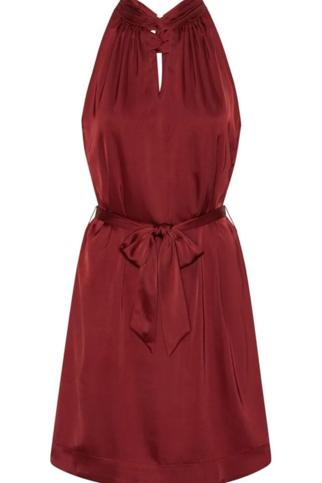 Kort kjole fra Karmamia i en dyb bordeauxrød farve. Kjolen har V-udskæring med halterneck og kommer med et bælte i taljen, som kan tages af.