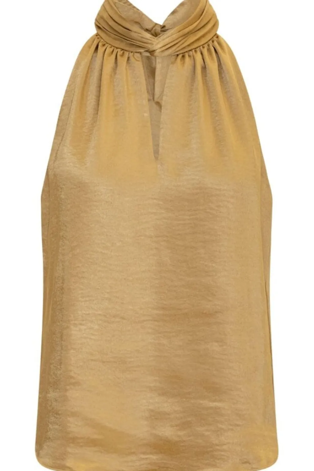 Guldfarvet top fra Karmamia med skinnende overflade. Toppen har en V-udskæring og fine flæsedetaljer omkring halsen. Den kan styles med Savannah-nederdelen eller bukser.