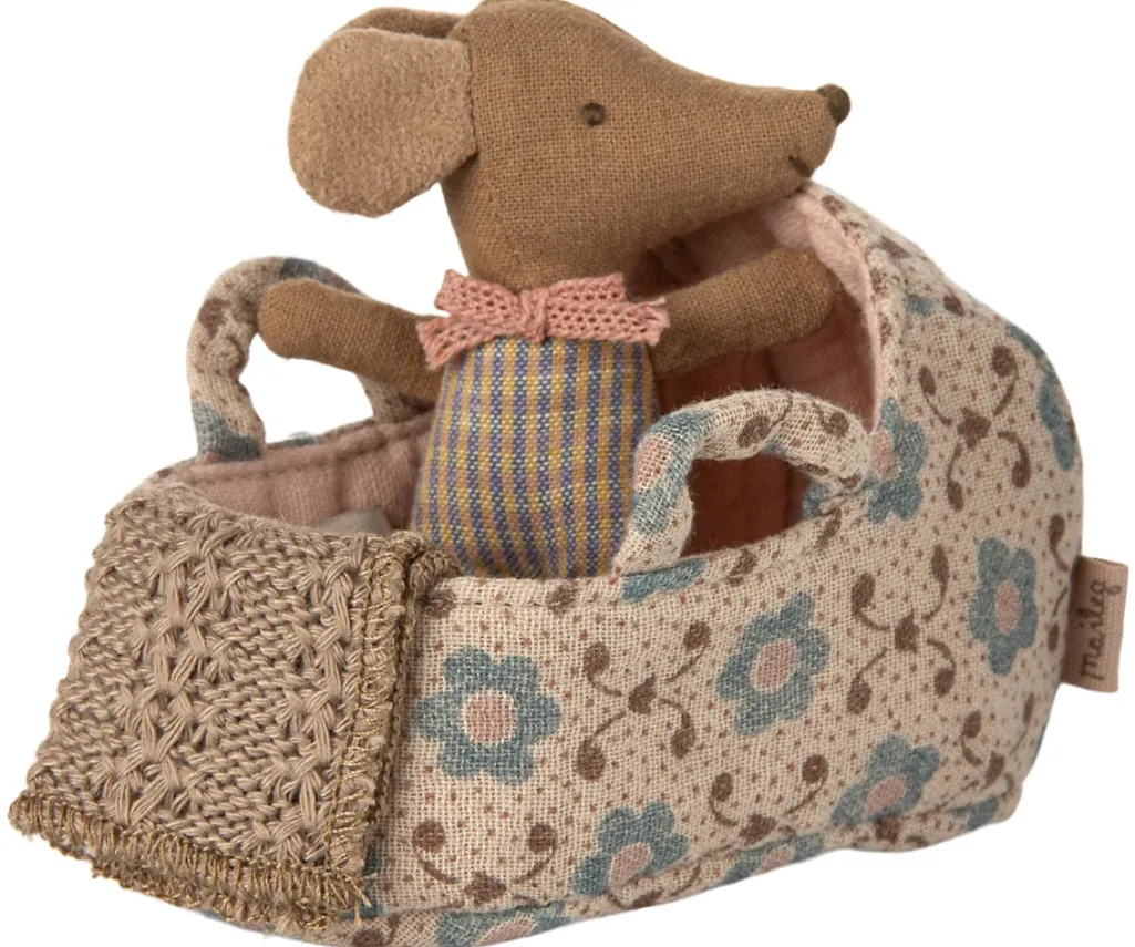 En babylift i bomuld fra Maileg til Baby Mus-figuren. Liften har blomsterprint i blå og brune nuancer og lyserød foring indvendigt.