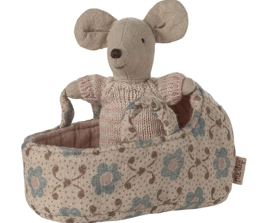 En babymus i babylift fra Maileg. Musen er iført en lyserød, stribet strikdragt og ligger i en vatteret babylift med blomsterprint.