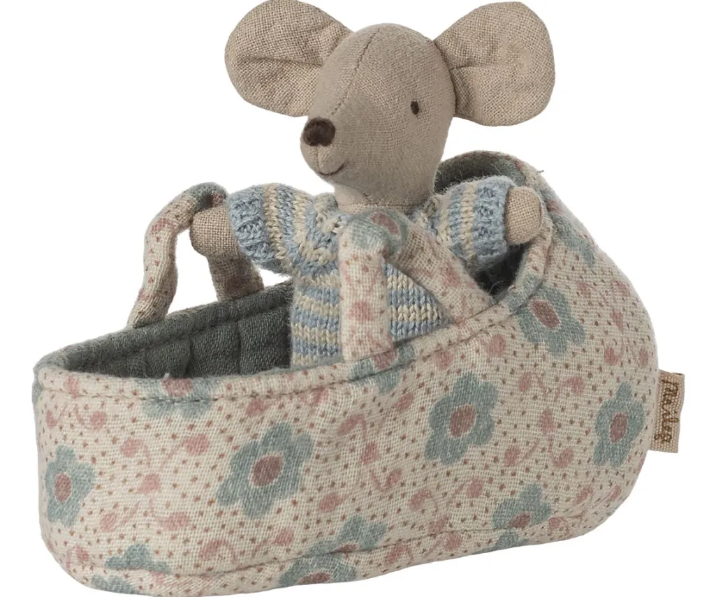 Babymusen ligger i en vatteret babylift med blomstret mønster. Liften har to håndtag, der gør den nem at bære rundt med.