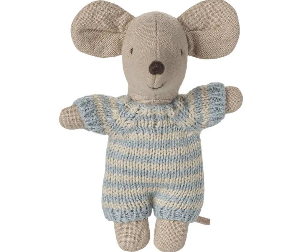 Musebabyen er klædt i en blød, stribet strikdragt i lyseblå og beige. Bomuldsmaterialet giver en blød følelse, der er egnet til leg.