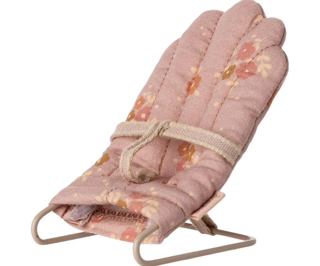 En babysitterstol fra Maileg i lyserød med blomsterprint. Stolen passer til Maileg My-størrelse kaniner, harer og musebørn.