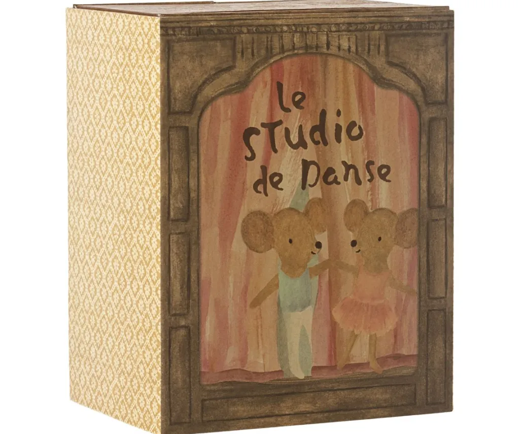 Et dansestudie med musefigurer fra Maileg i beige og brun. Æsken fungerer som både dansestudie og musehus til fantasifuld leg.