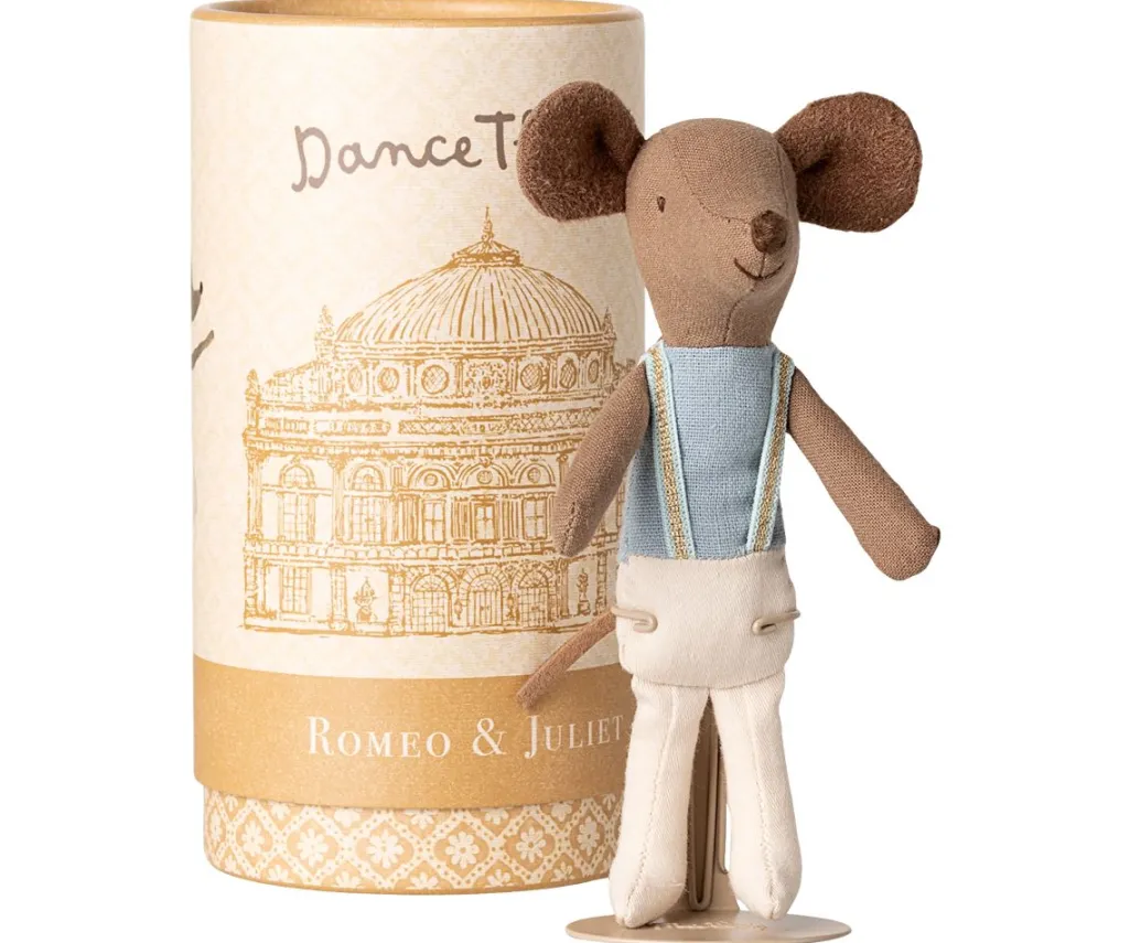 En balletdanser-mus fra Maileg med brune ører og hale, iført en lyseblå top og hvide bukser.