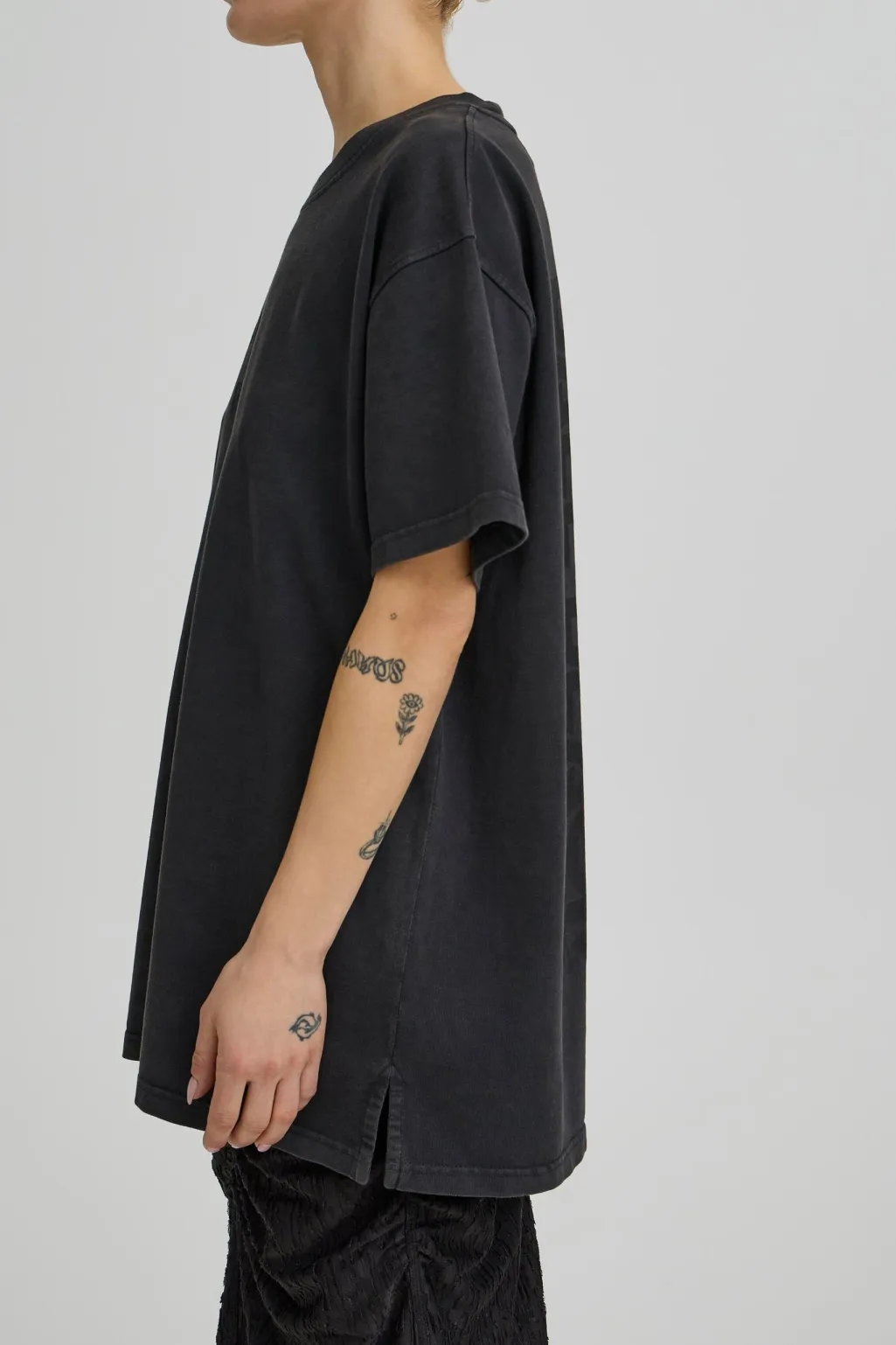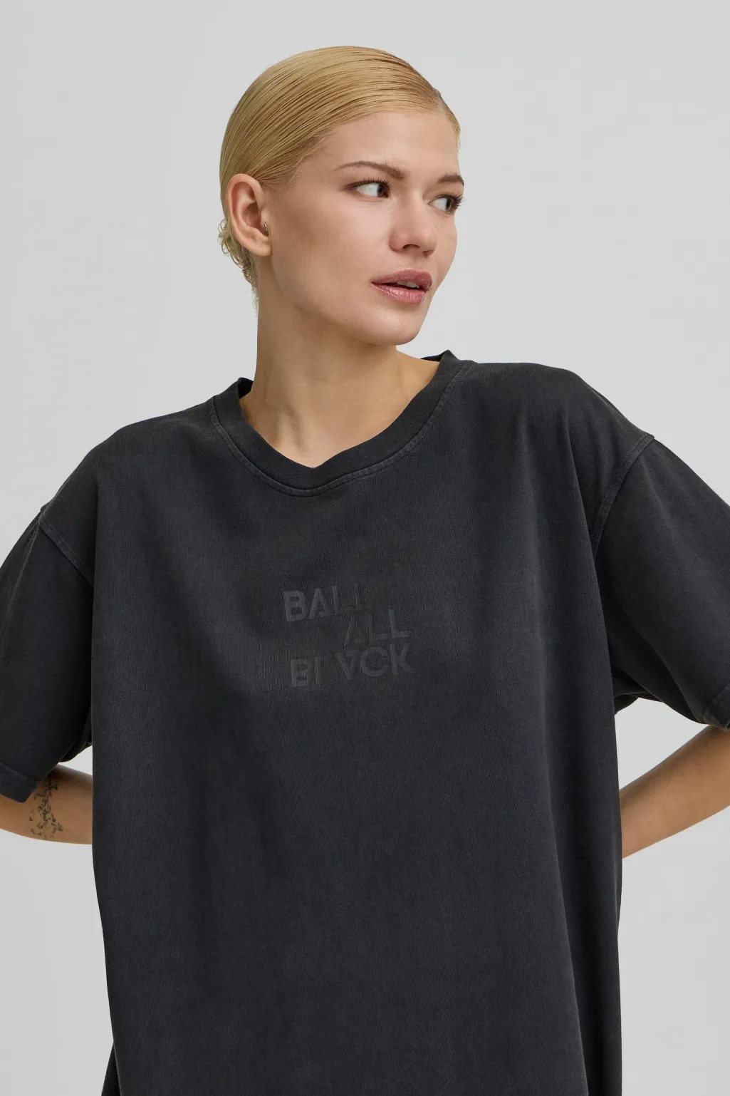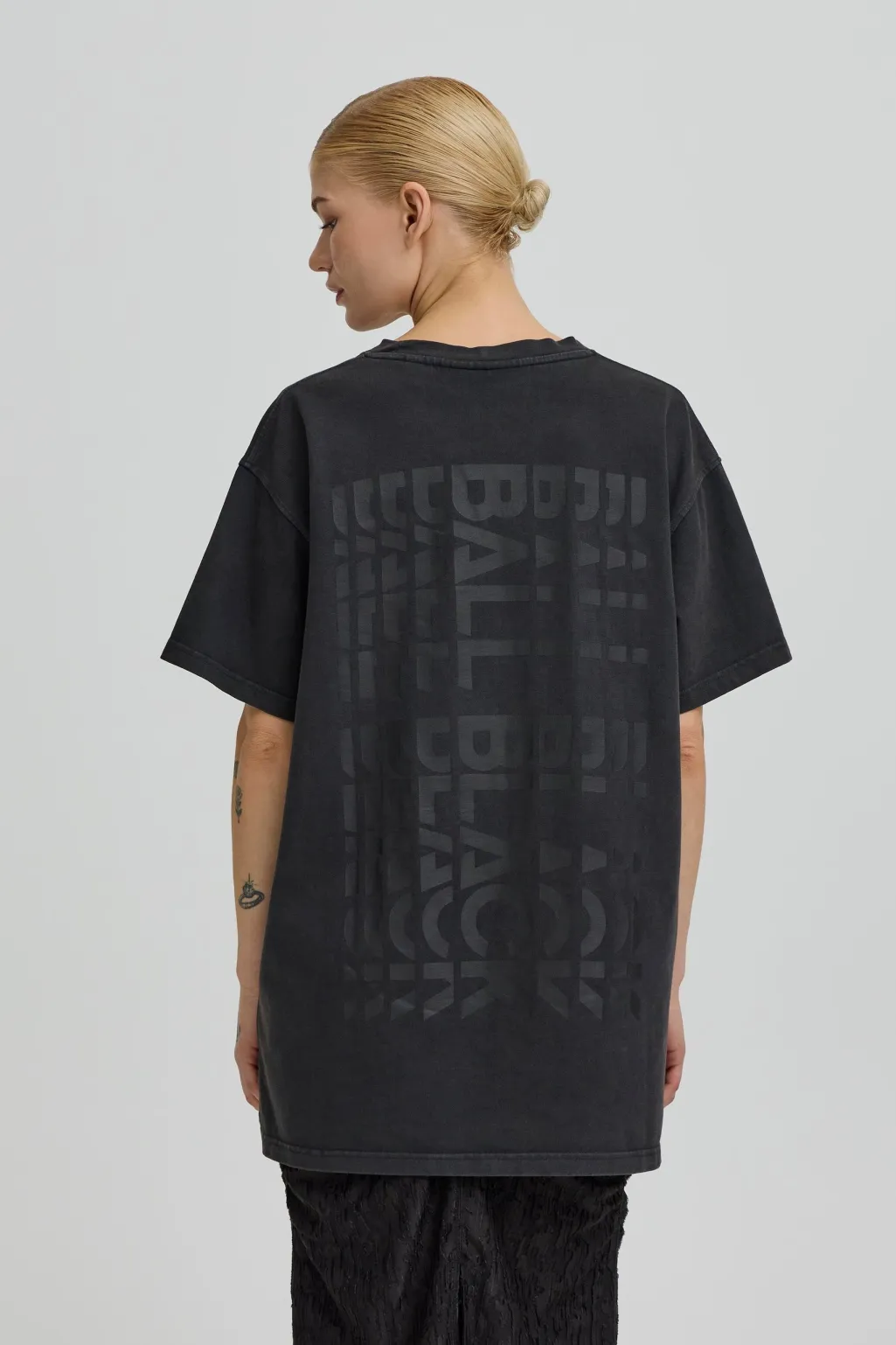 Sort T-shirt fra Ball med oversized pasform. Lavet af 100 % bomuld. Har tekstprint på forsiden og et gentaget tekstmønster på bagsiden.