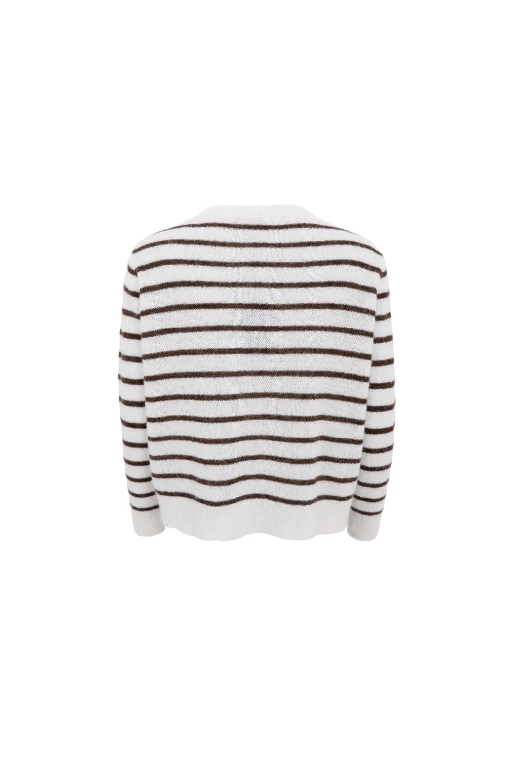 En stribet cardigan fra Black Colour i off-white med brune vandrette striber. Cardiganen har rund halsudskæring og knaplukning foran.