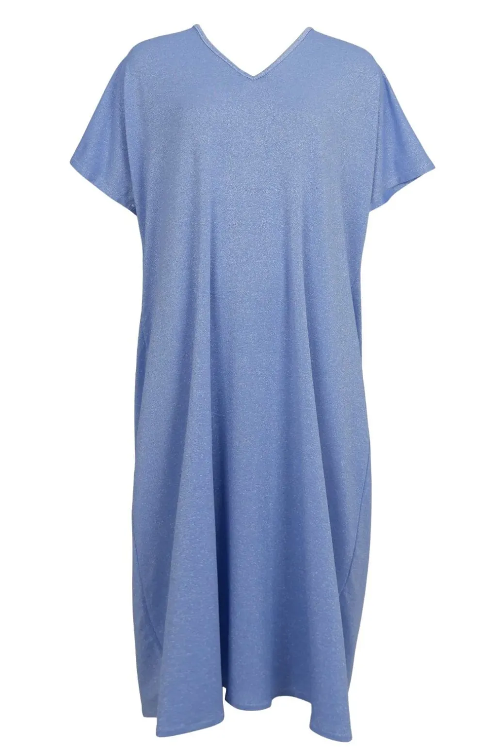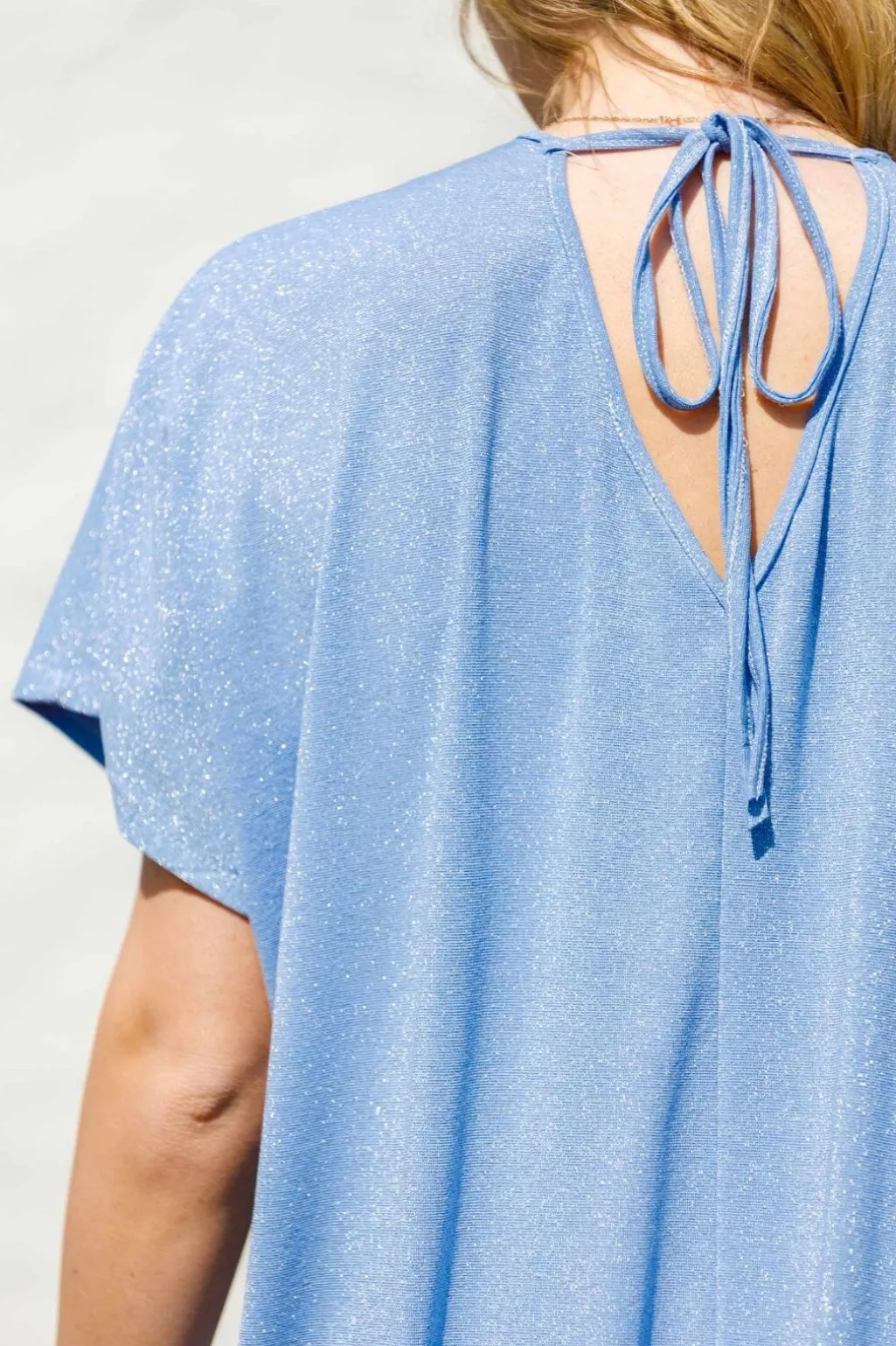 Lyseblå kjole fra Black Colour med V-udskæring. Den løse kjole har korte ærmer og snorelukning i ryggen. Stoffet har en let glans og falder blødt.