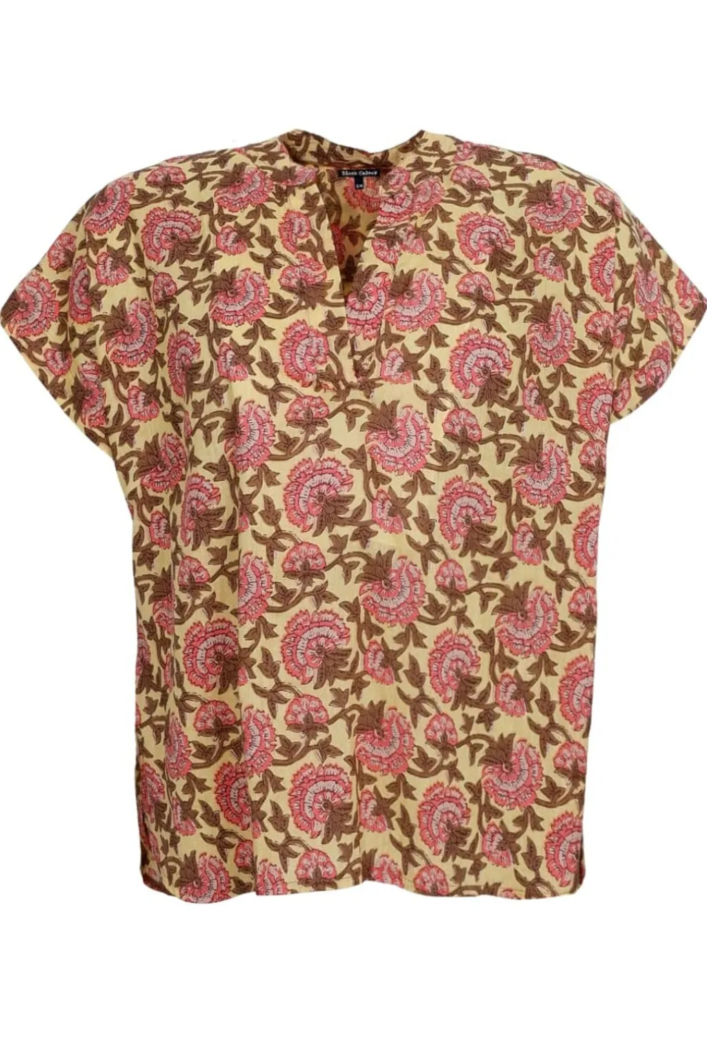 Gul bomuldsbluse fra Black Colour med pink blomstermønster og brune blade. Blusen har flæsedetaljer, korte ærmer og v-halsudskæring.