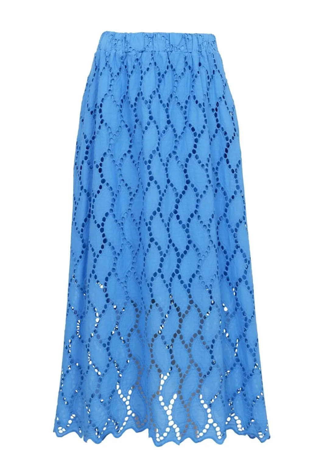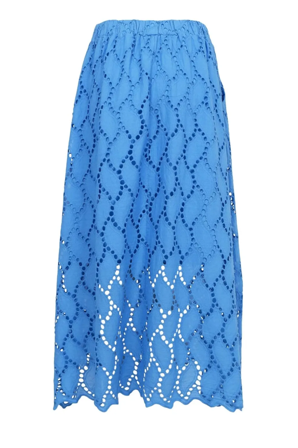 Blondernederdel fra Black Colour i oceanblå. Den har et gennemgående hulmønster og når til læggene. Elastikken i taljen giver god bevægelsesfrihed.