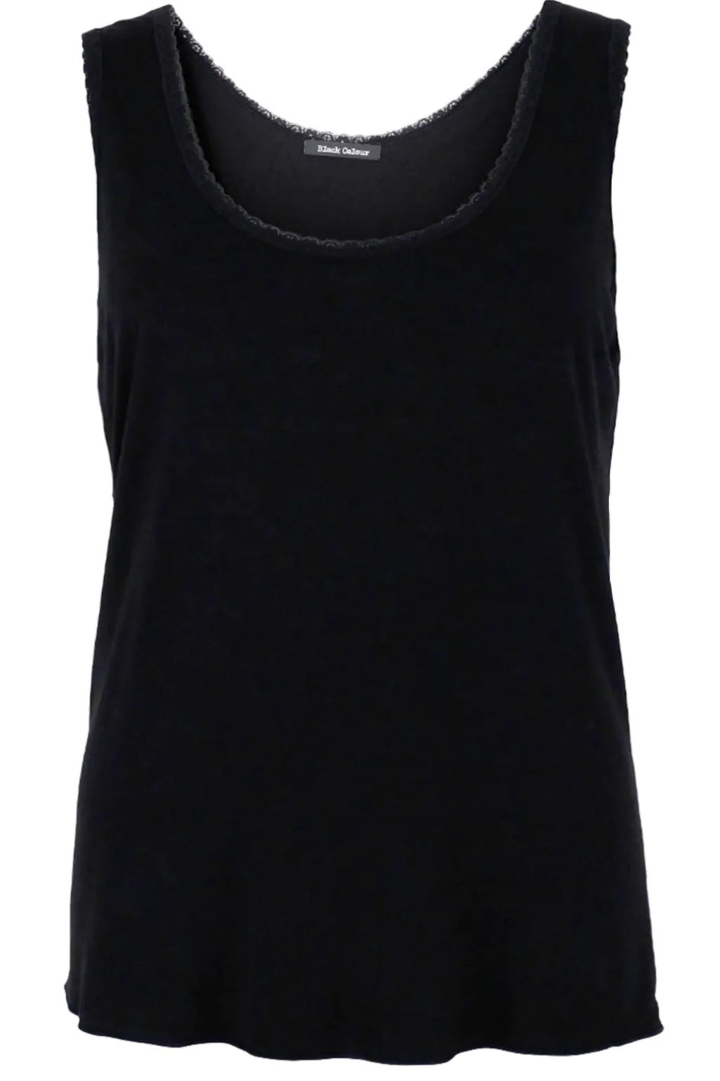 Sort top fra Black Colour i blødt viskose med rund hals. Den ærmeløse stil har dekorative syninger langs halsudskæringen og ærmegabet.