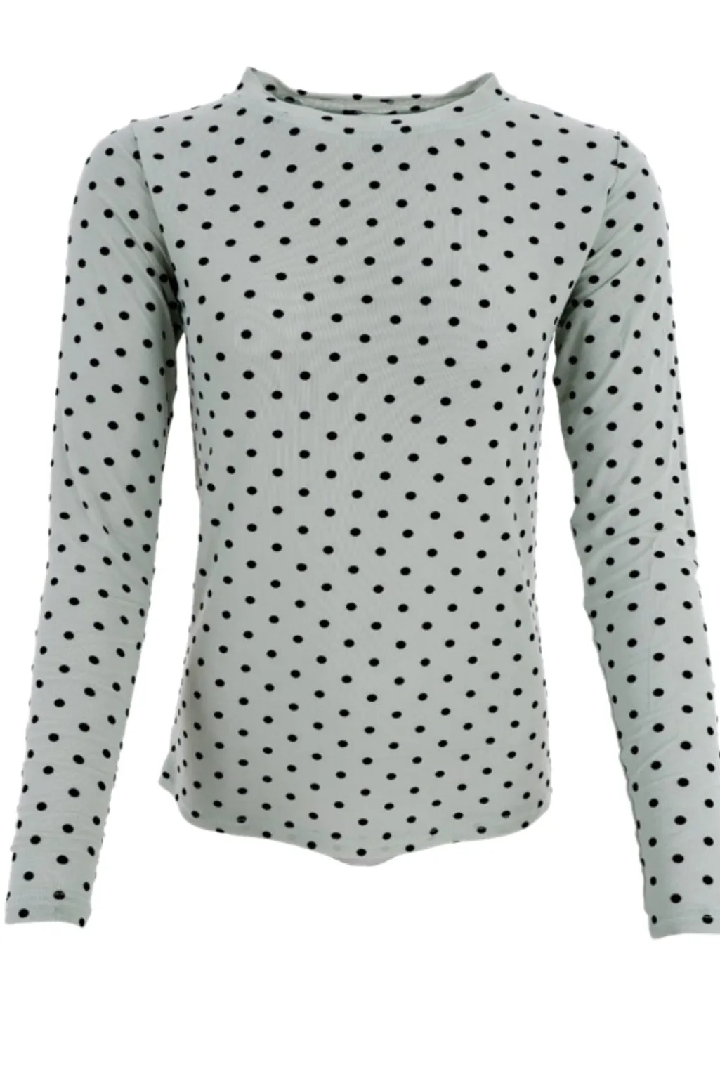 Mesh-bluse fra Black Colour i pastelgrøn med sorte prikker. Den transparente mesh-kvalitet har høj hals og lange ærmer.