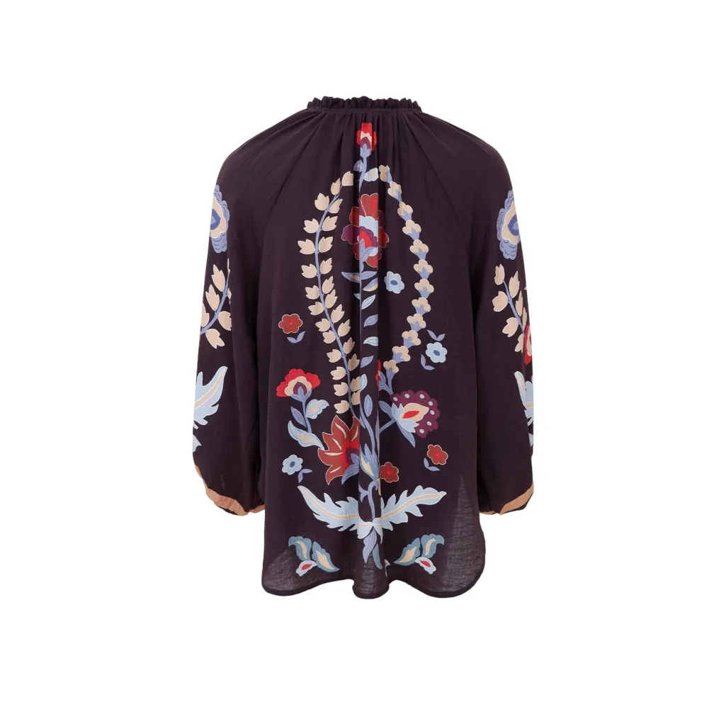 Bluse fra Black Colour i mørkebrun med blomsterprint i røde, blå og beige nuancer. Blusen har bindebånd, broderi og flæser.
