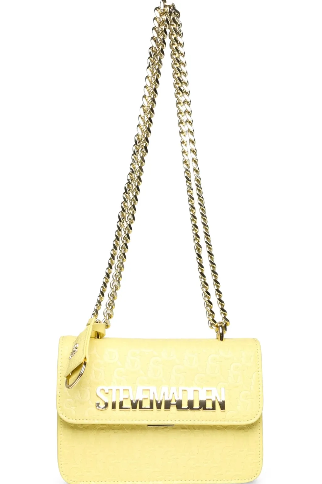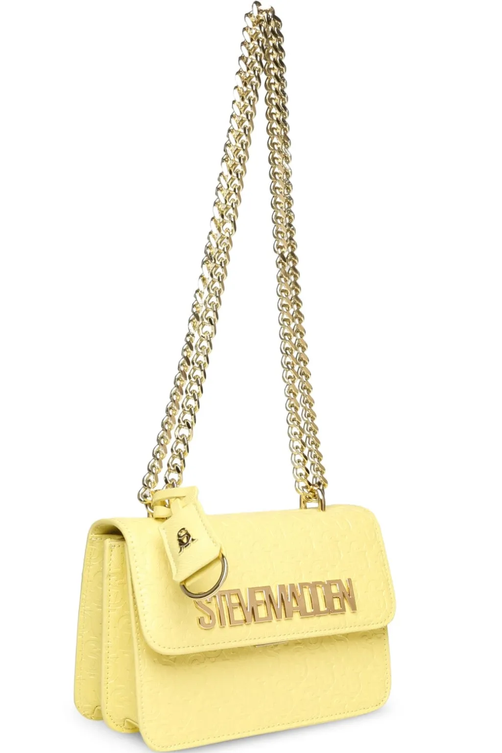Gul taske fra Steve Madden i syntetisk materiale med guldfarvet kæde. Tasken har en justerbar rem og en rummelig indvendig sektion med magnetlukning.