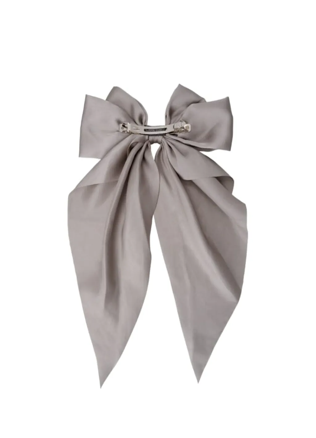 Grå hårsløjfe fra Black Colour i satinmateriale med lange haler. Sløjfen har en skinnende overflade og er udstyret med en clips på bagsiden til nem fastgørelse i håret.