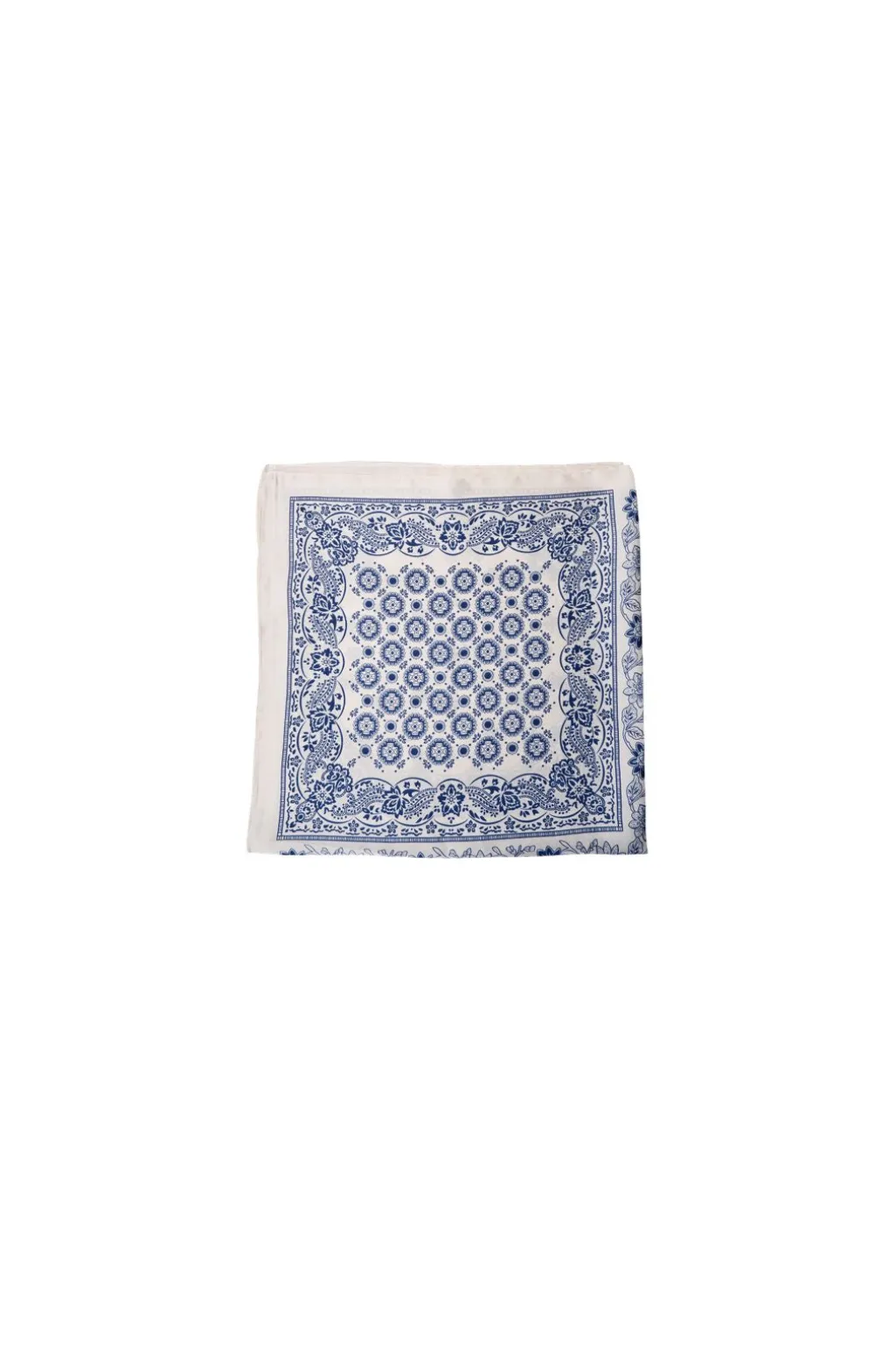 Mini tørklæde fra Black Colour, lavet af polyester i en beige nuance. Det symmetriske mønster kombinerer blå og hvid i paisley-elementer med blomsterdetaljer.