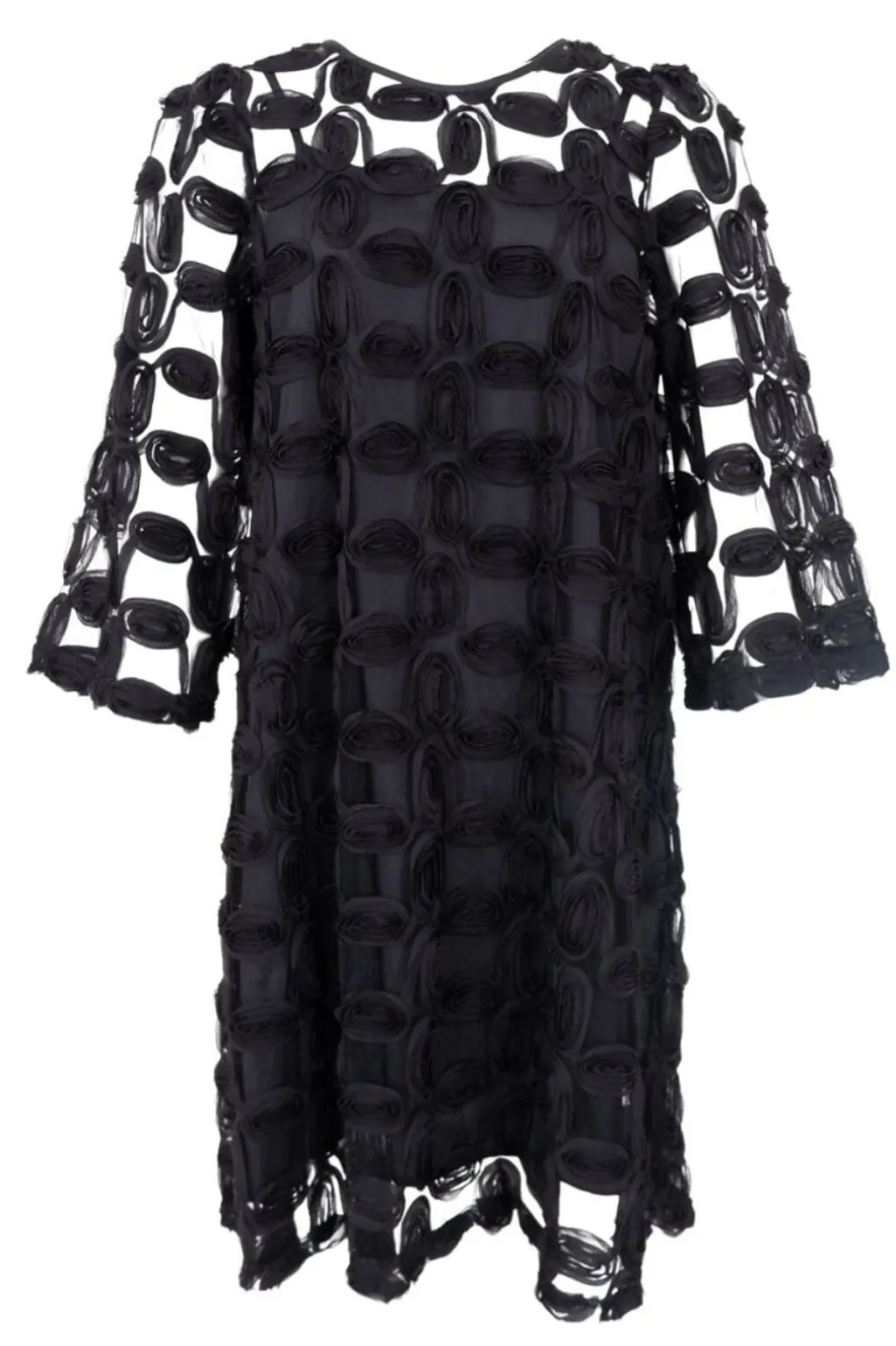 Sort kjole fra Black Colour med et særligt gittermønster. Kjolen har trekvartærmer og en rund halsudskæring med en lille nøglehulsåbning i nakken. Designet kombinerer broderi og blonder.