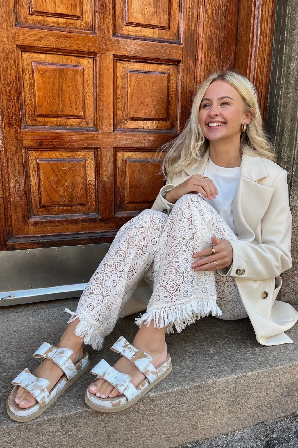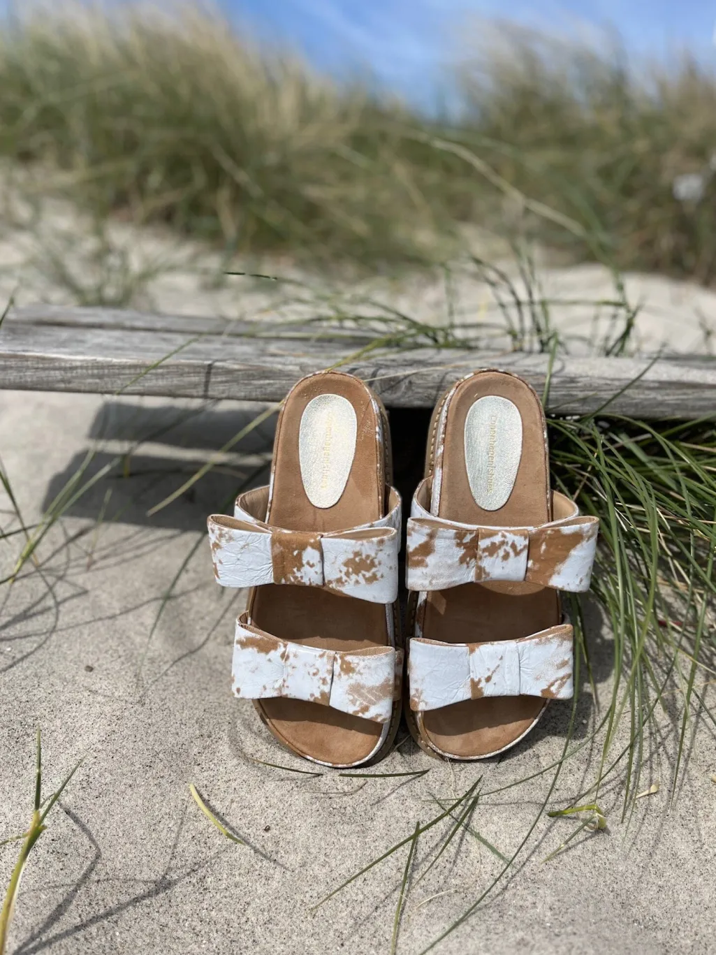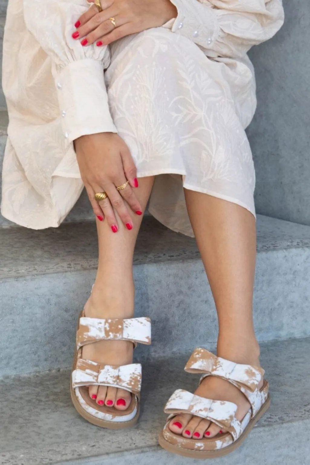 Sandaler fra Copenhagen Shoes i safari og off white nuancer. Fremstillet i ruskind med to store sløjfer på remmene og åben tå.