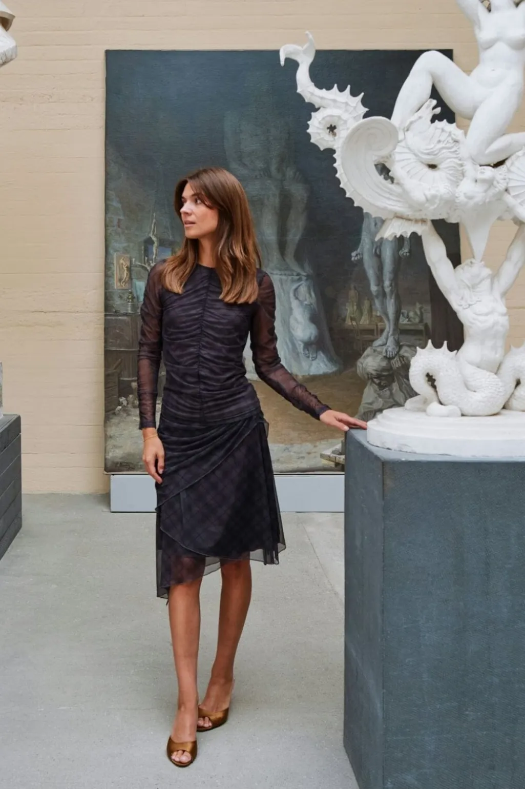 Mørkegrå meshbluse fra Neo Noir med ternet mønster. Blusen har gennemsigtige lange ærmer og rynkede detaljer på både ærmer og krop, som skaber dybde i designet.