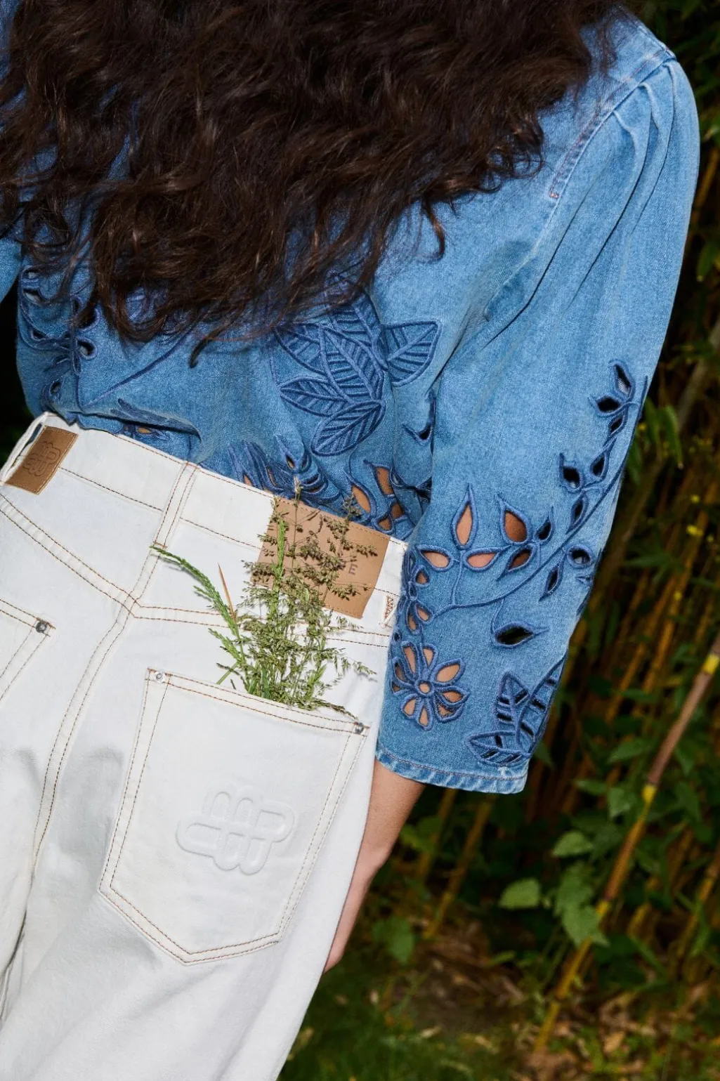 Bukser fra Munthe i en lys elfenbensfarve. De er lavet af 99 % økologisk bomuld med 1 % elastan.