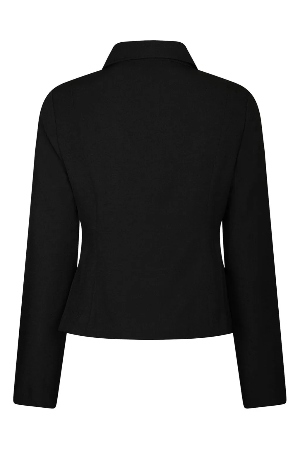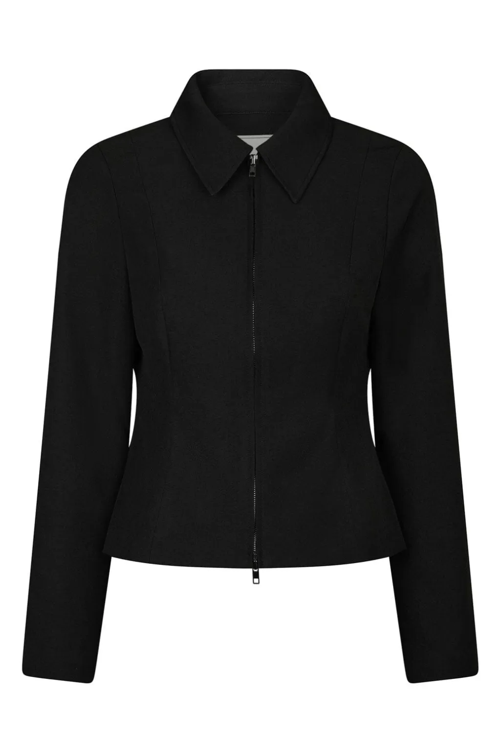 Sort struktureret bluse fra Neo Noir med skjortekrave og lynlås foran. Blusen har en tætsiddende pasform og lange ærmer med flared design.