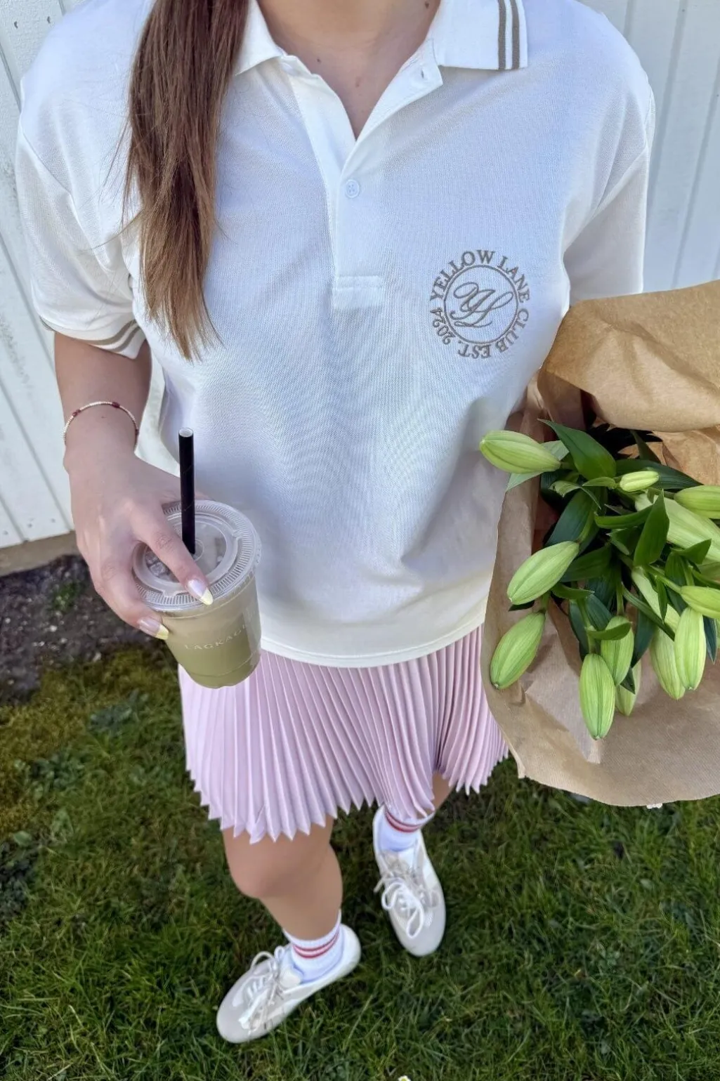 Off-white polo fra Yellow Lane med brune striber på kraven og ærmerne. Et broderet logo pryder venstre side af brystet med teksten YELLOW LANE og EST. 1994.