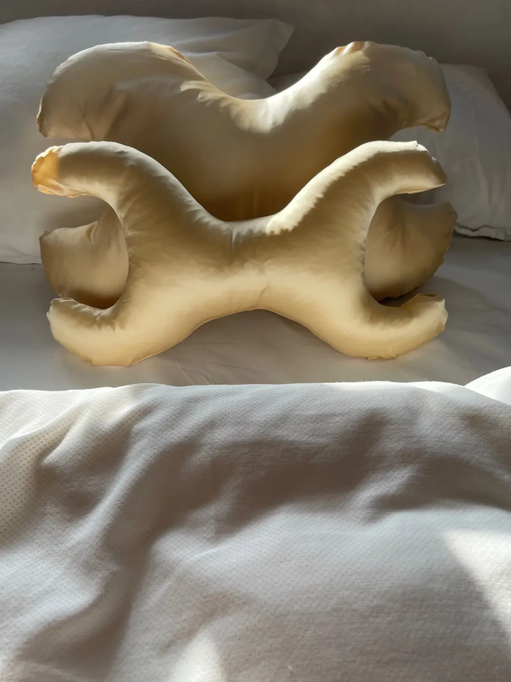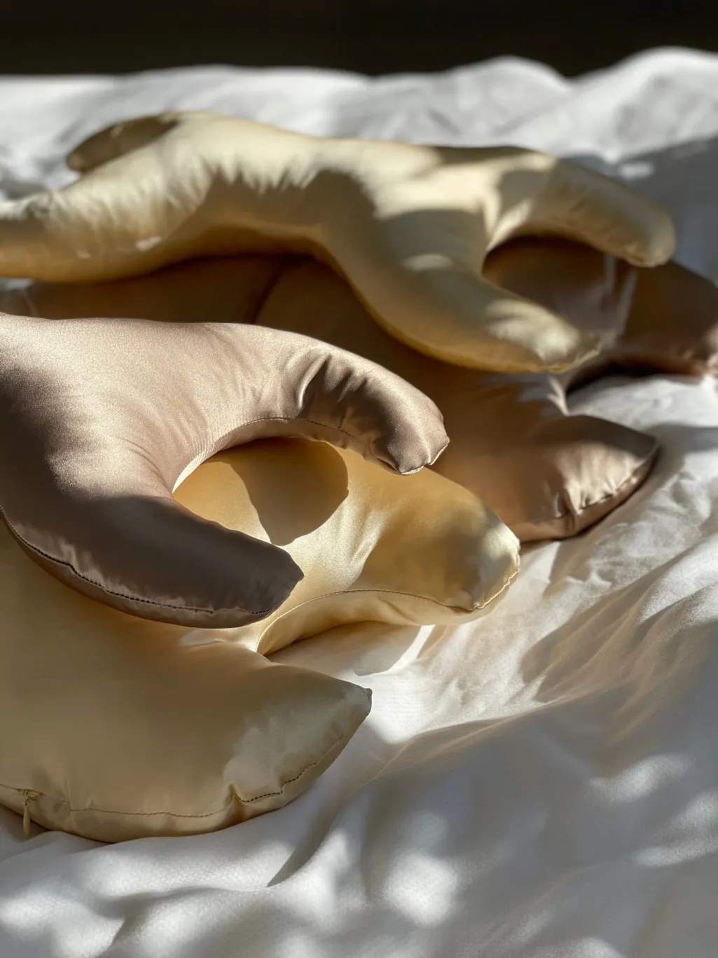 Guldfarvet pudebetræk fra Save My Face med en specialdesignet form. Betrækket er fremstillet i blød charmeuse-silke med temperaturregulerende og antibakterielle egenskaber.