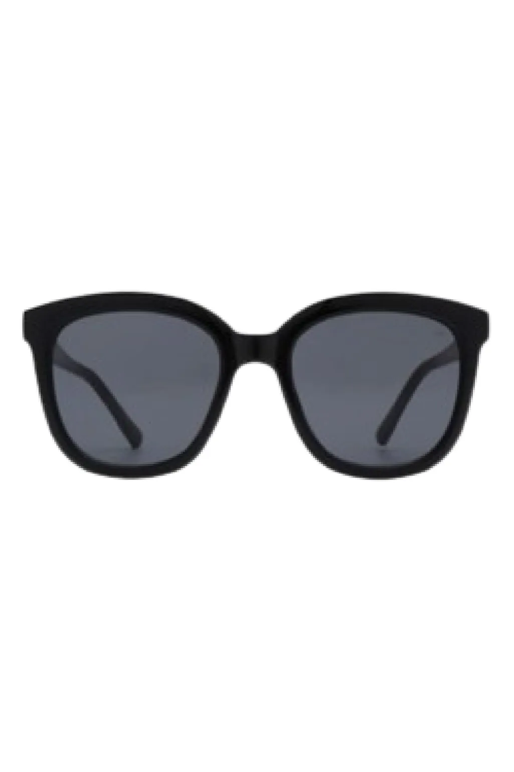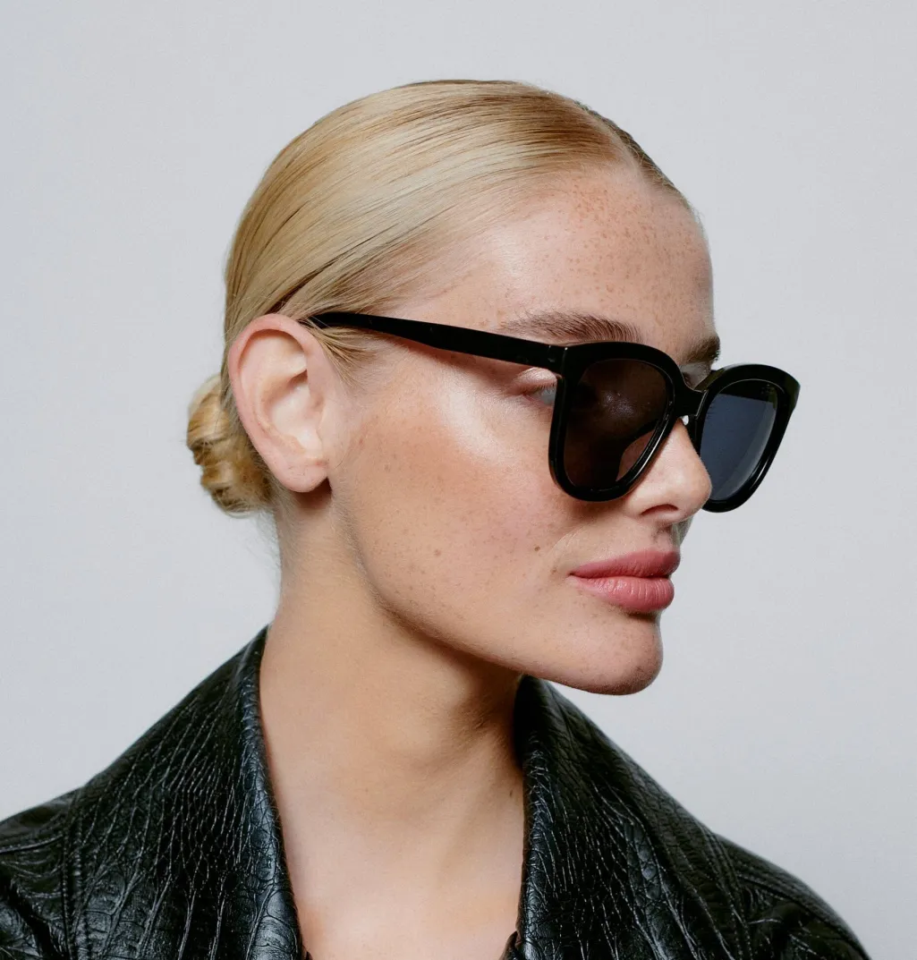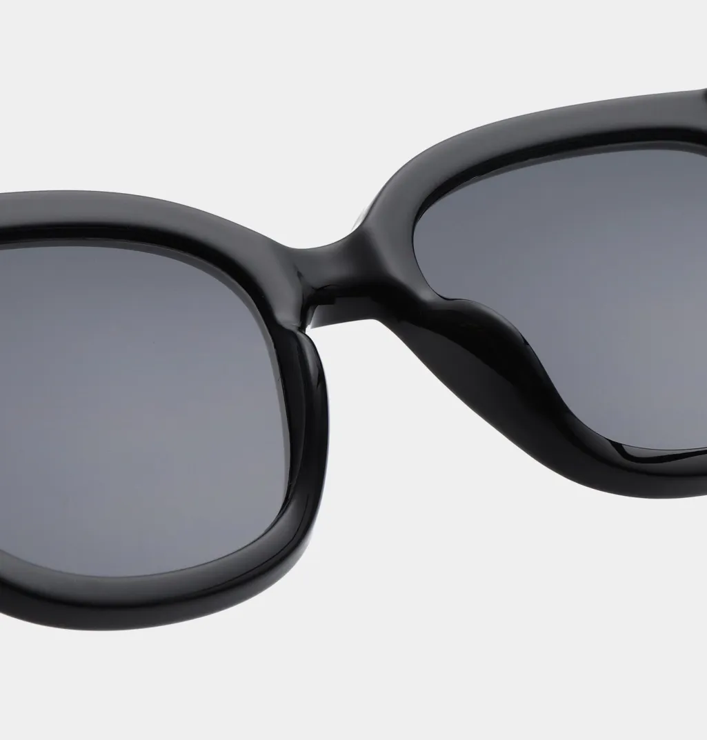 Sorte solbriller fra A. Kjærbede med store firkantede linser og mat ramme. Brillerne har UV 400-beskyttelse og formbare stænger med metalkerner for god pasform.
