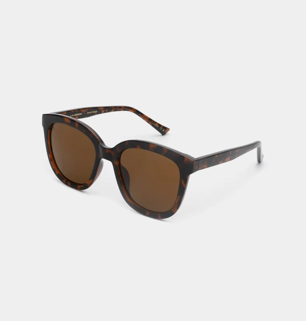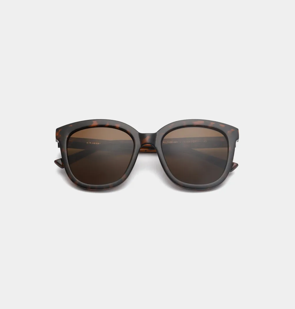 Solbriller fra A. Kjærbede i rektangulær form med brune linser. Stellet har et demi tortoise-mønster og er fremstillet i holdbart polycarbonat med formbare brillestænger.