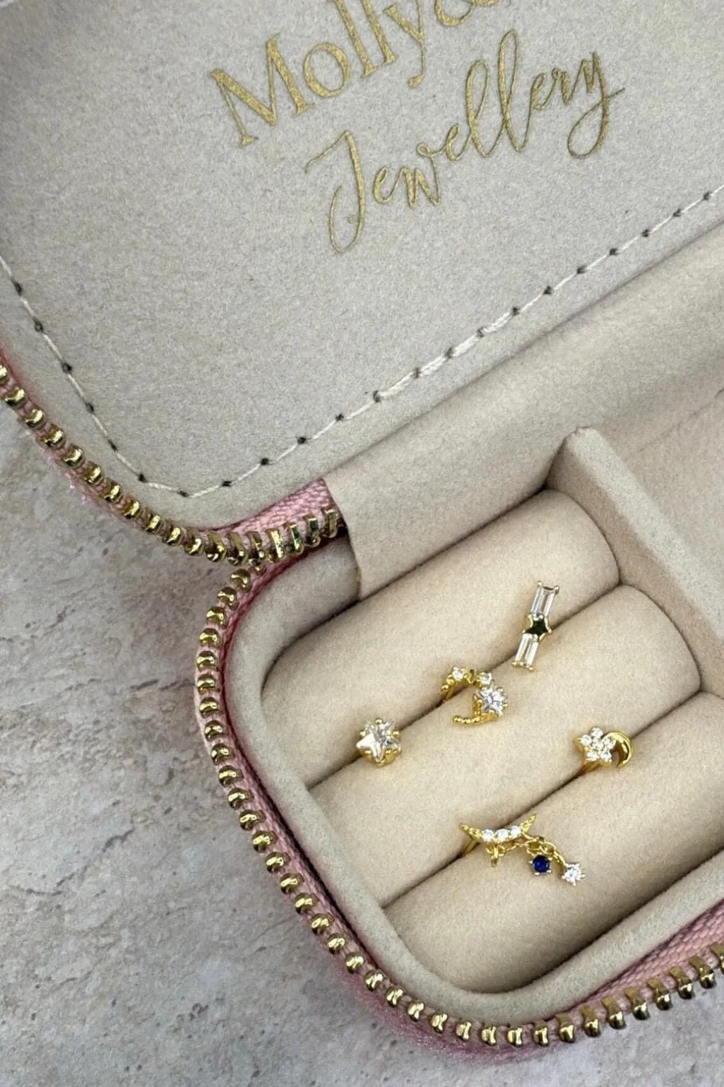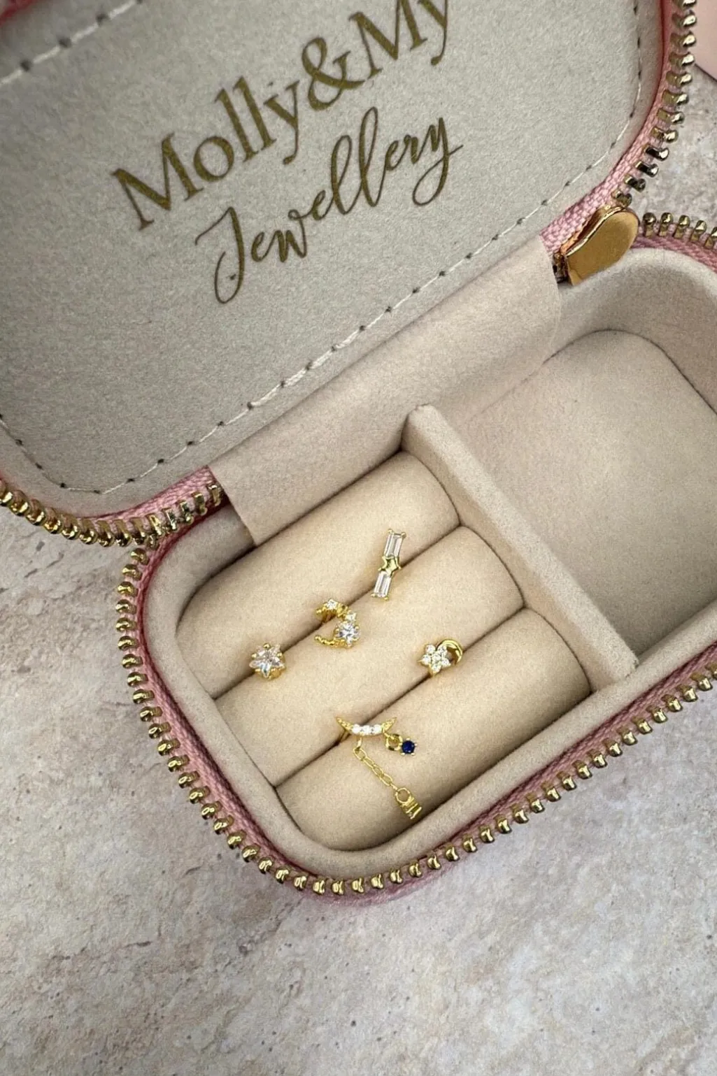 Øreringe fra Molly&My Jewellery lavet af rustfrit stål med en forgyldt sølvfinish. Smykkerne har gyldne detaljer og sten i forskellige former.