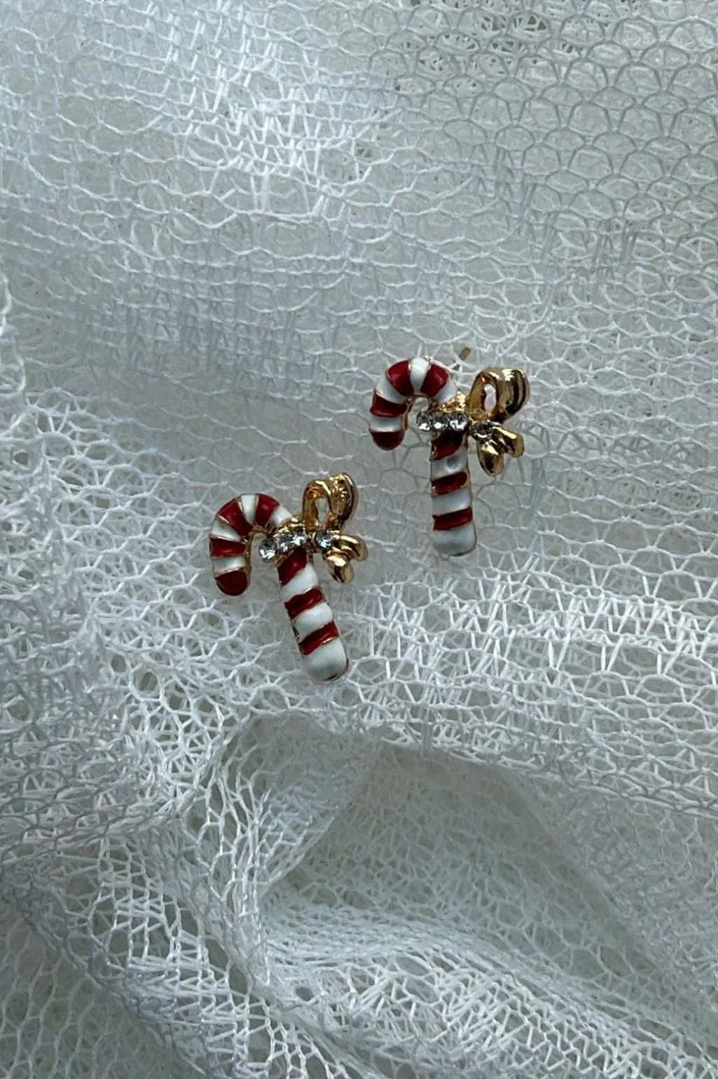 Øreringe fra Molly&My Jewellery designet som slikstokke med røde og hvide striber. De har en lille guldfarvet sløjfe og en klar sten.