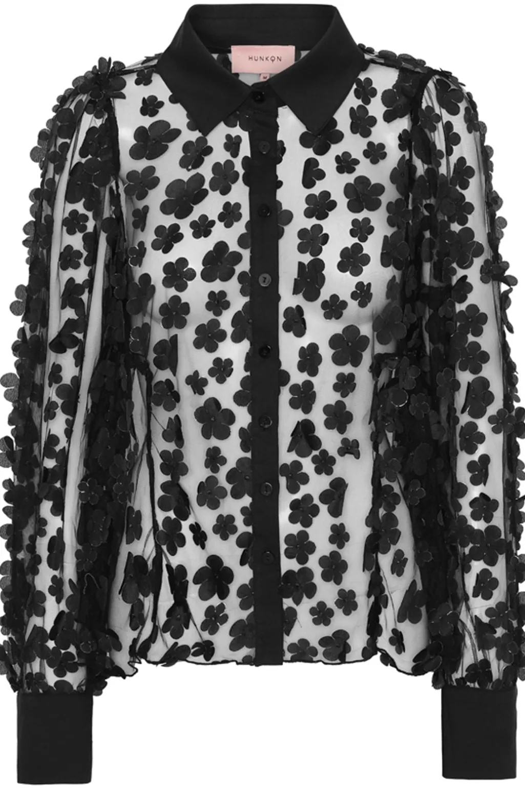 Hunkøn Kassandra Shirt er en klassisk skjorte i lidt transparent materiale. Skjorten er prydet med delikate blomster applikationer med en skinnende sølv kant og har en lys A-form med en smule rynker fra taljen skåret i ryggen. Kassandra har en synlig knaplukning hele vejen ned foran og en klassisk skjortekrave. De lange brede ærmer har en lille puf i skulderen, og er samlet med en manchet ved håndleddet.