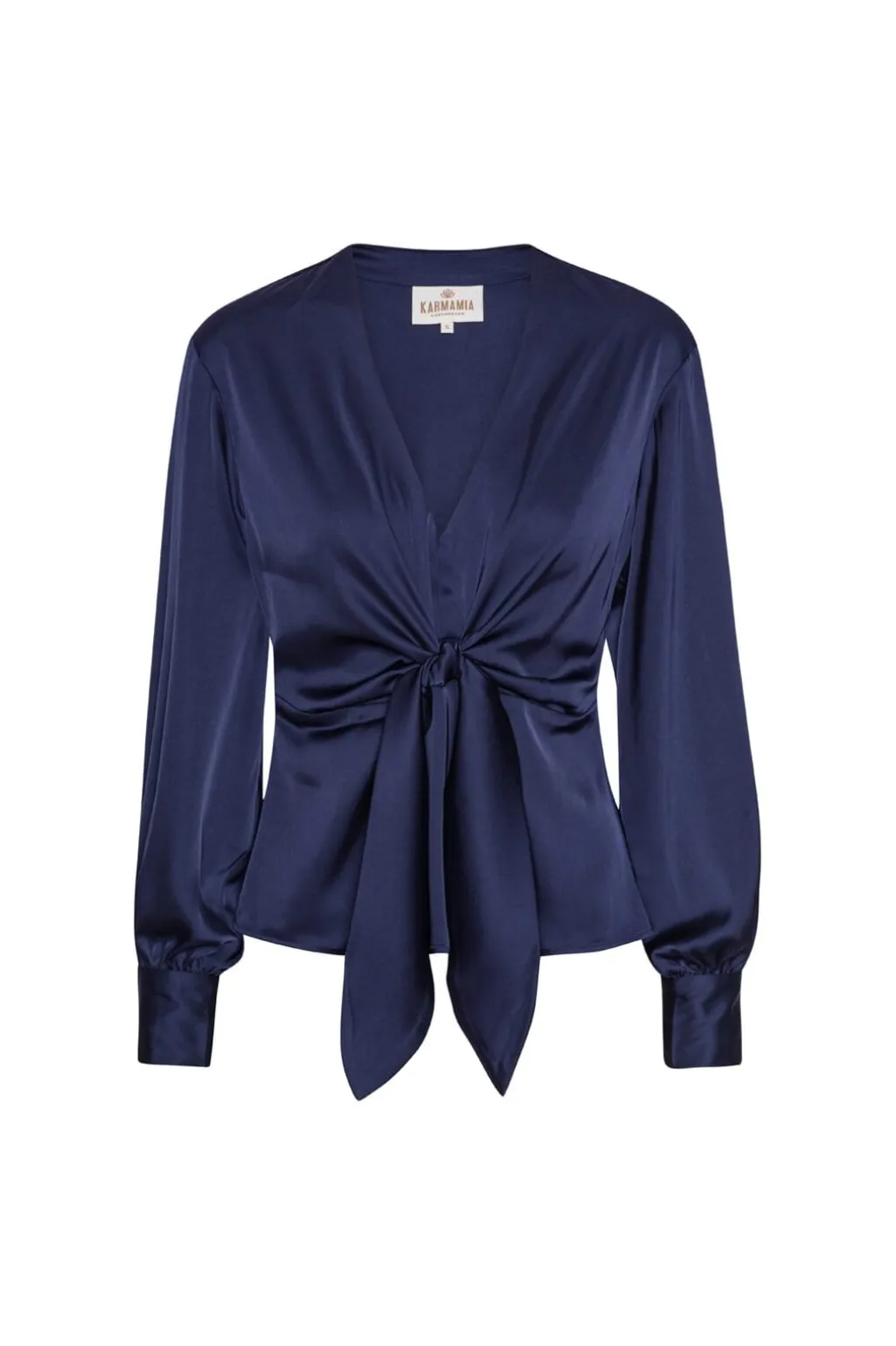 Mørkeblå bluse fra Karmamia med dyb V-hals og knudedetalje foran. Blusen har lange ærmer med manchetter og et blankt stof med et flot fald.