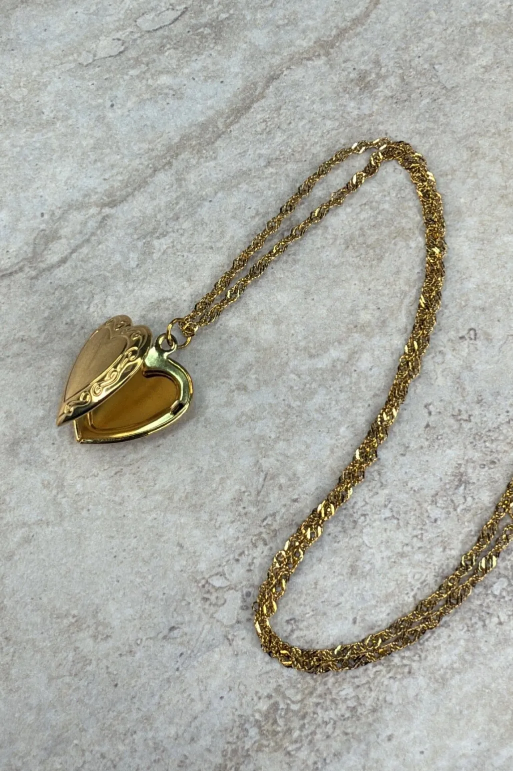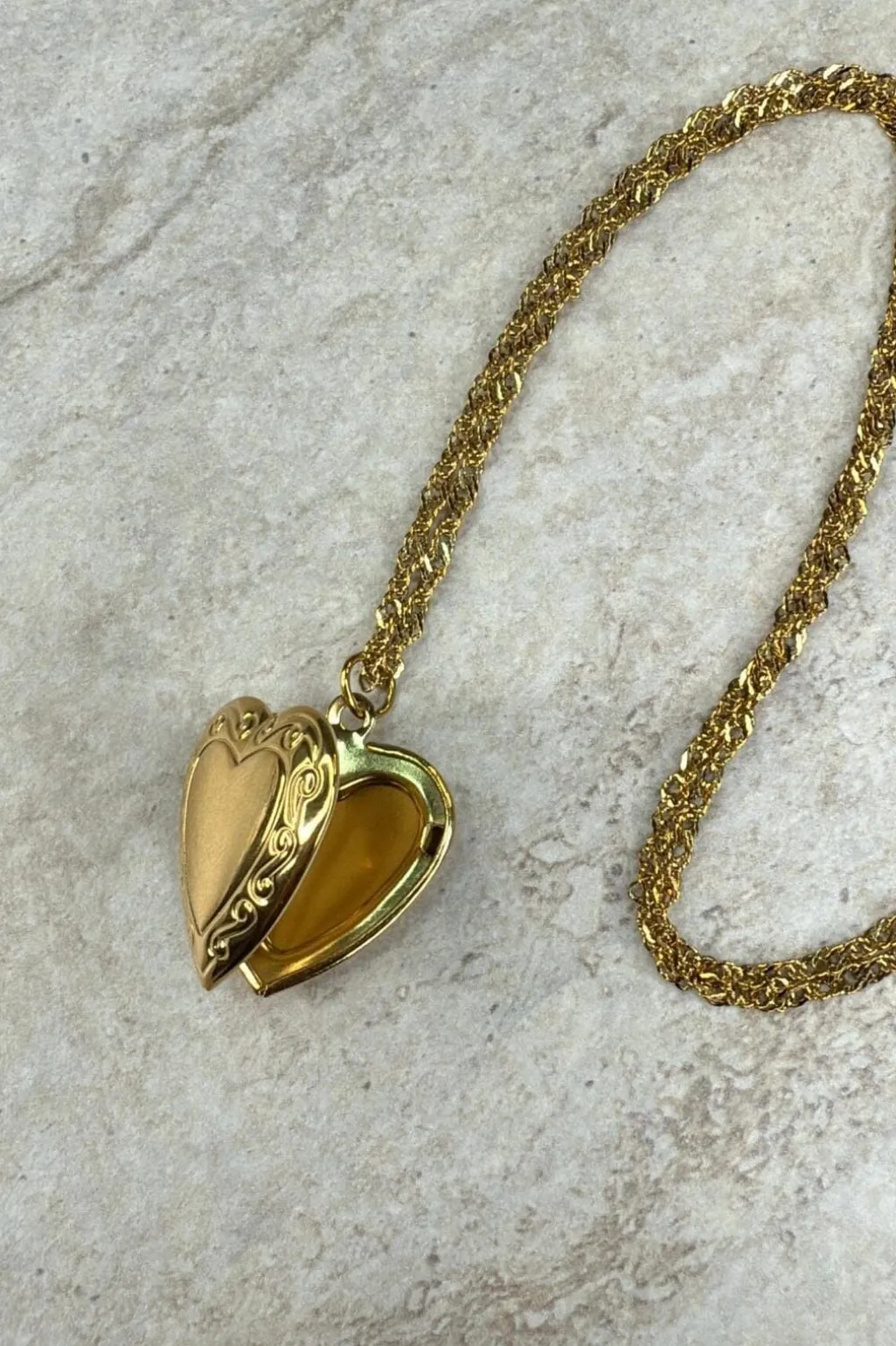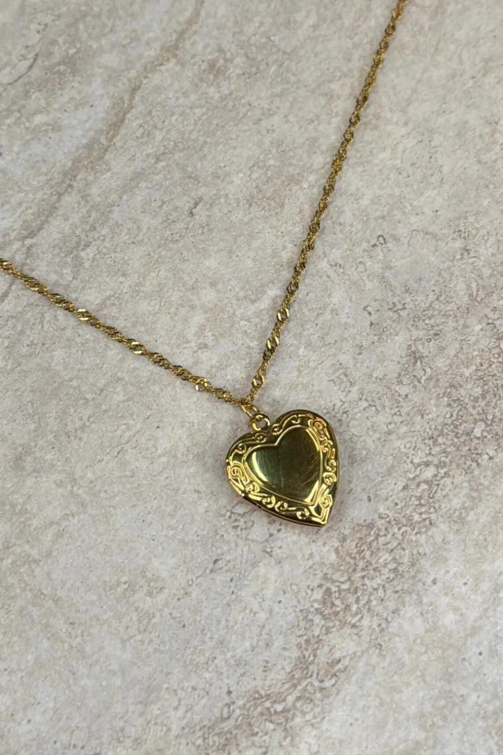 Halskæde fra Molly&My Jewellery med hjerteformet medaillon i forgyldt rustfrit stål. Blokhus-designet har mønstrede kanter, og låsen kan åbnes.