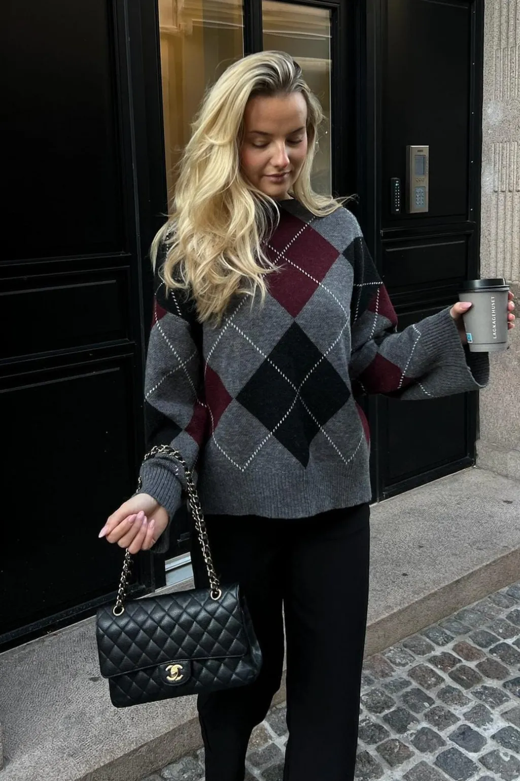 - Argyle-mønster i grå, sort og bordeaux