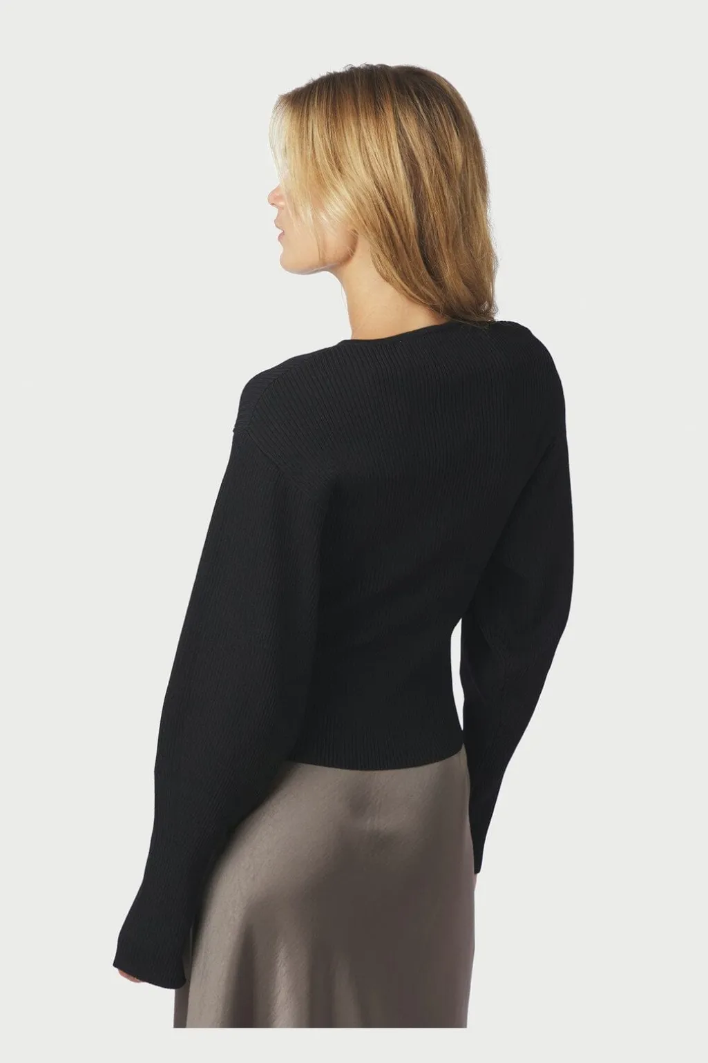 Sort strikket cardigan fra Neo Noir med ribbet tekstur. Den har en tætsiddende pasform, rund halsudskæring og knapper hele vejen ned foran.