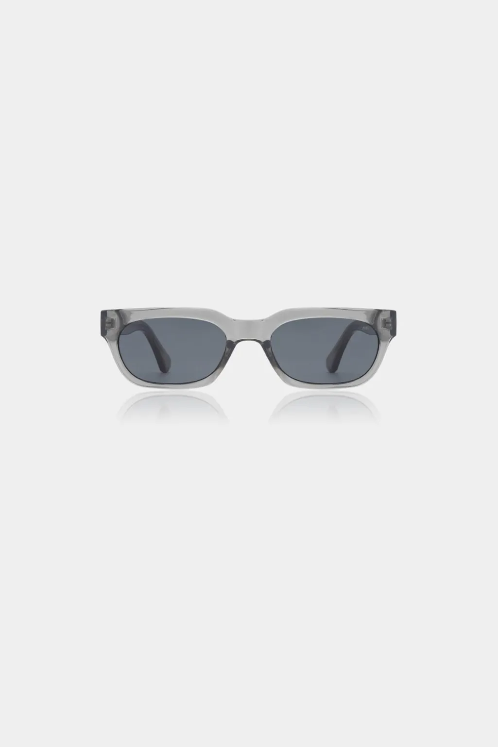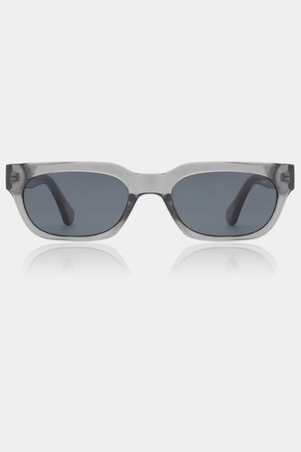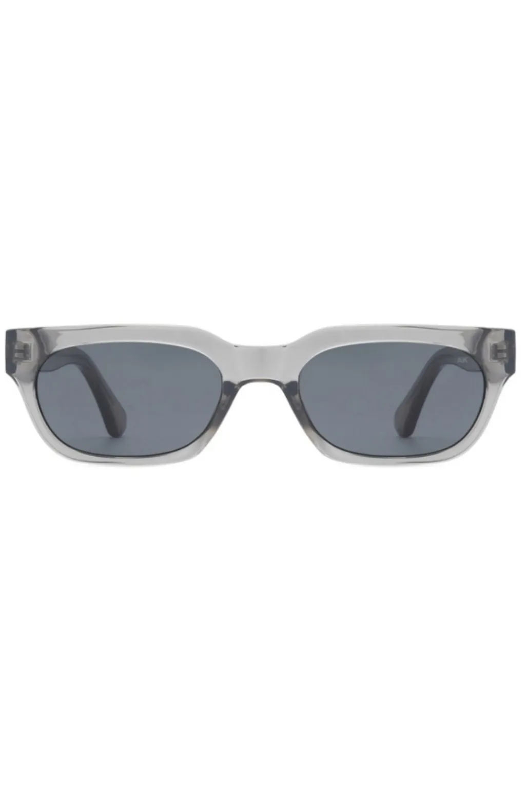 Solbriller fra A. Kjærbede i grå transparent med rektangulær form. Brillerne er lavet af Tritan Renew med mørke linser og har et gennemsigtigt stel.