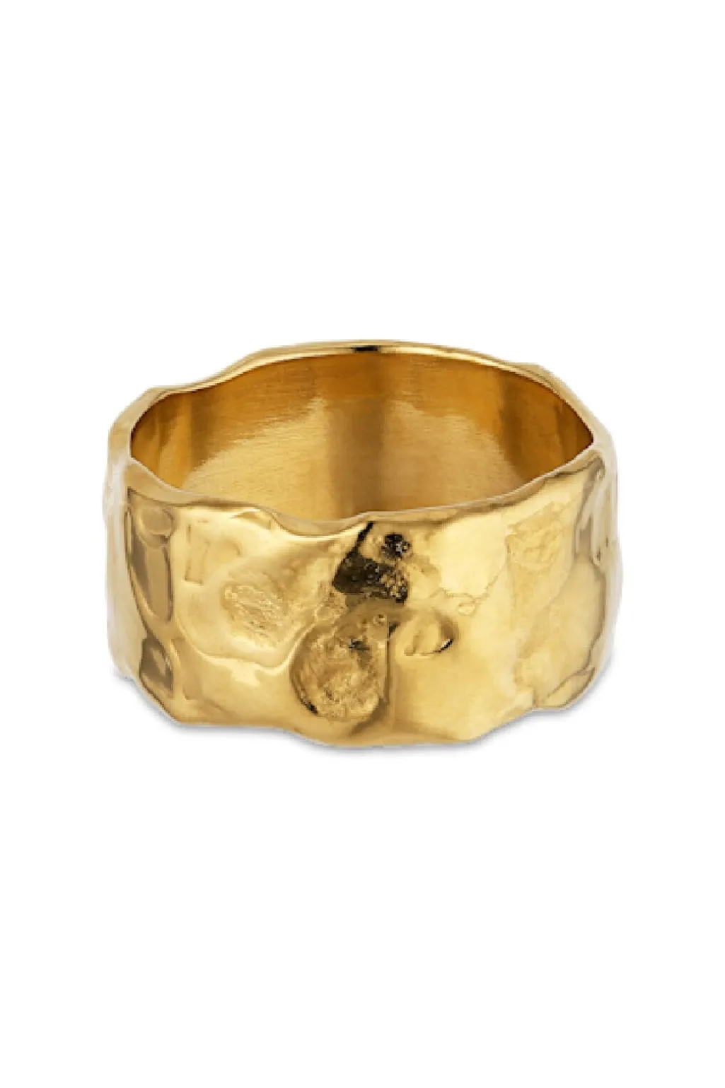 Ring fra Jane Kønig med en organisk og ujævn overflade. Den er fremstillet i forgyldt sølv med en blank finish og har en bred, rustik form med teksturerede detaljer.