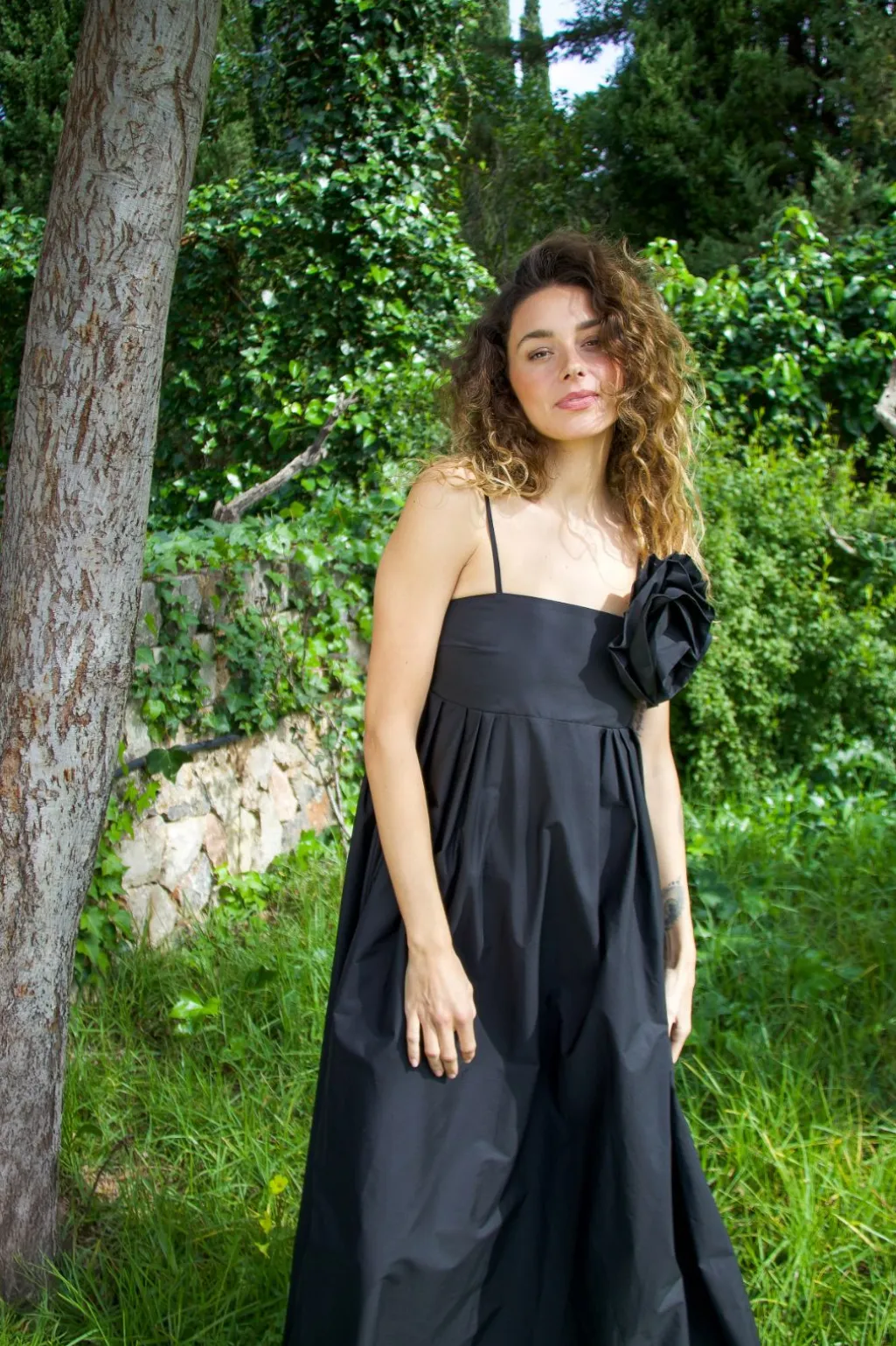 Sort festkjole fra Cras med firkantet udskæring og gulvlængde. Kjolen har en stor blomsterdetalje på skulderen og er lavet i et rent bomuldsstof med en draperet silhuet.